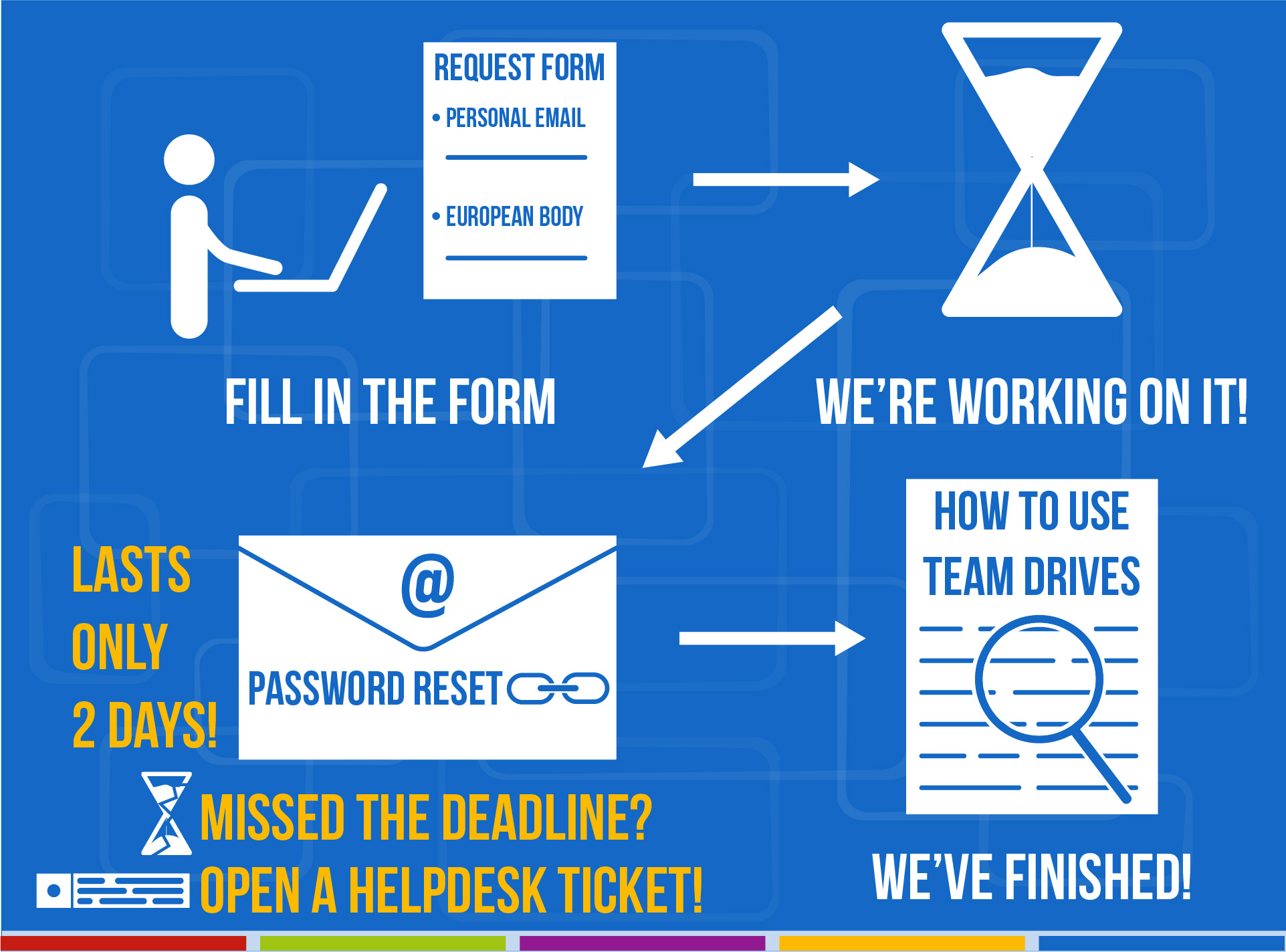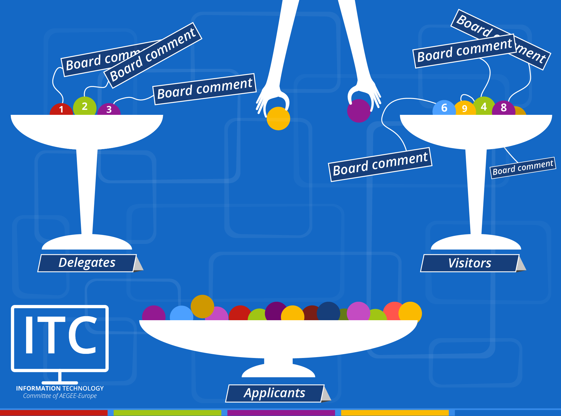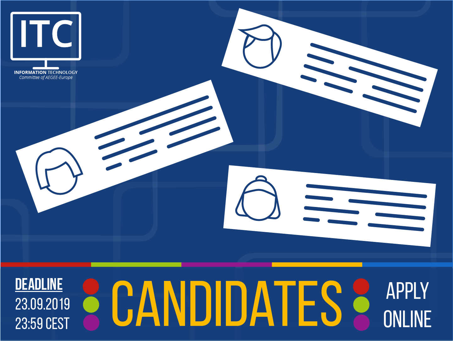 Моей задачей было создать инфографику для постов на тему использования новой онлайн-платформы MyAEGEE с целью повысить осведомленность пользователей, для постов-знакомств и для поста о наборе новых членов комитета. В данных работах я объединила визуальную айдентику AEGEE (цвета, шрифты, цветные линии) с элементами, придуманными и нарисованными мною, визуально описывая главную тему поста.