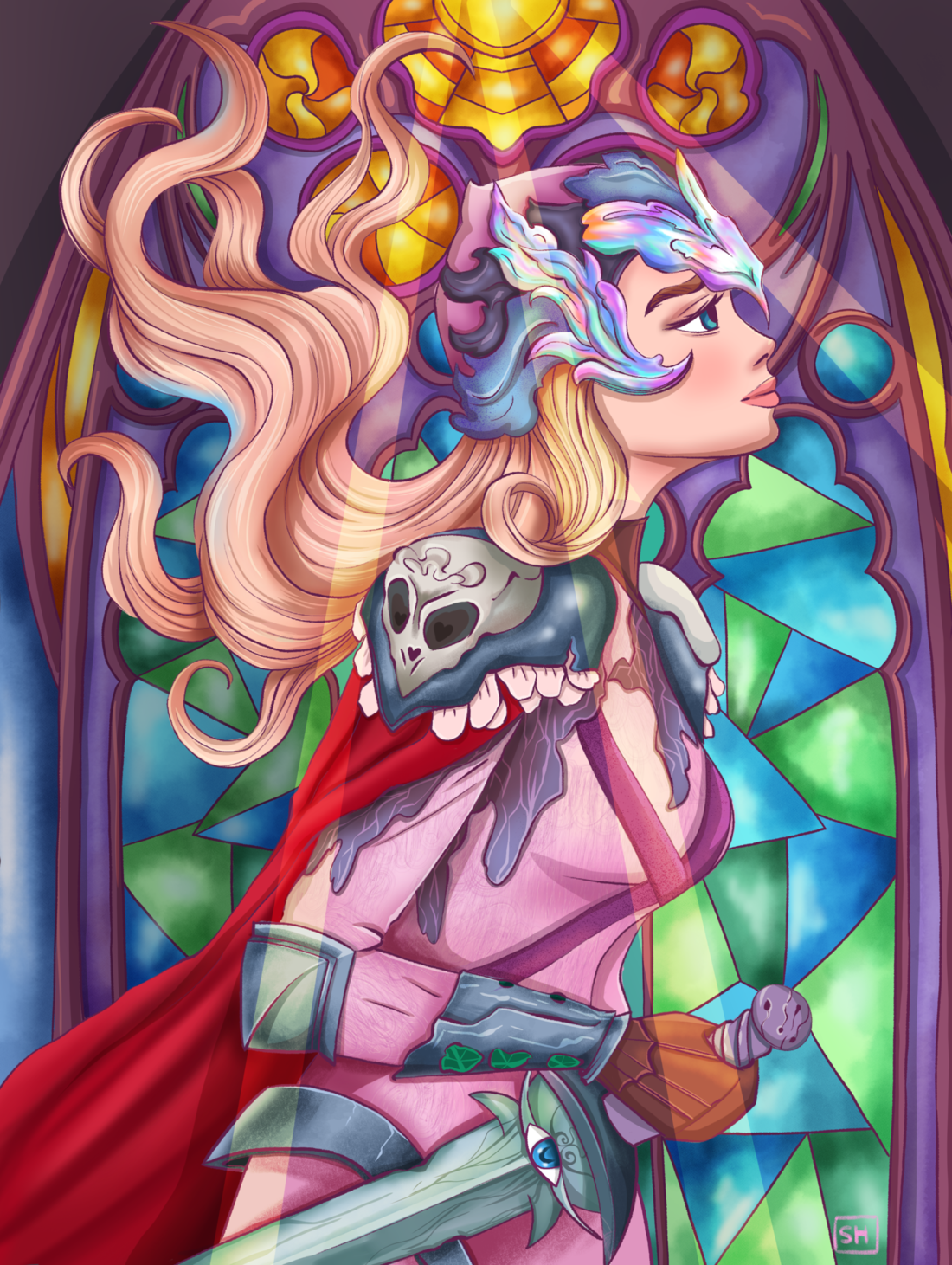 Иллюстрация была вдохновлена внутренней силой духа и стремлением идти вперед. Девушка -рыцарь в современном мире не новость , но очередной повод пофантазировать о фантастических мирах и подвигах . На фоне проиллюстрирован декоративный витраж, как отражение множества намерений и их целостности . А так же можно заметить свет попадающий в окна , что говорит о ясности и оптимистичности. Меч с глазом символизирует не слепо направленную воинственность . Атрибуты костюма сочестают в себе нежность , власть и мистичность . А приподнятый подбородок героини и направленная вперед поза говорит о готовности идти вперед.