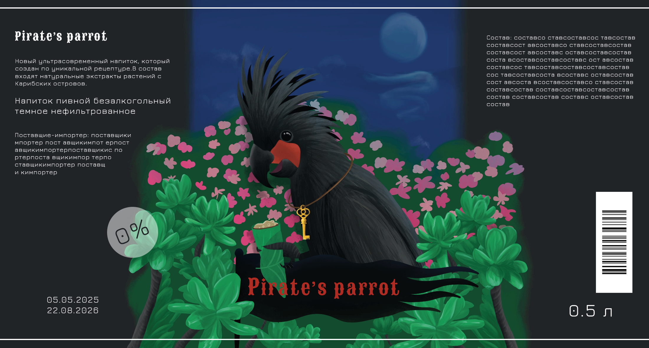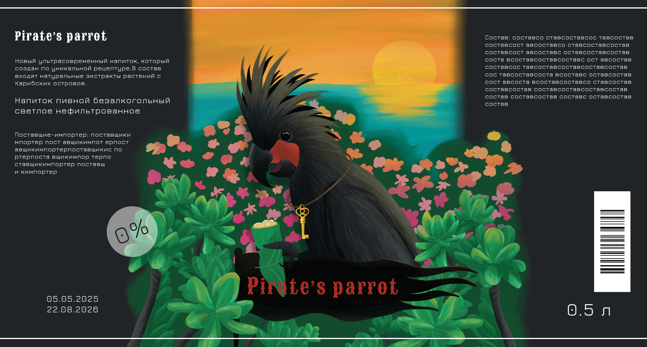Иллюстрации к упаковке пиратского пива с маскотом в виде черного какаду. В его составе растения с карибских островов.