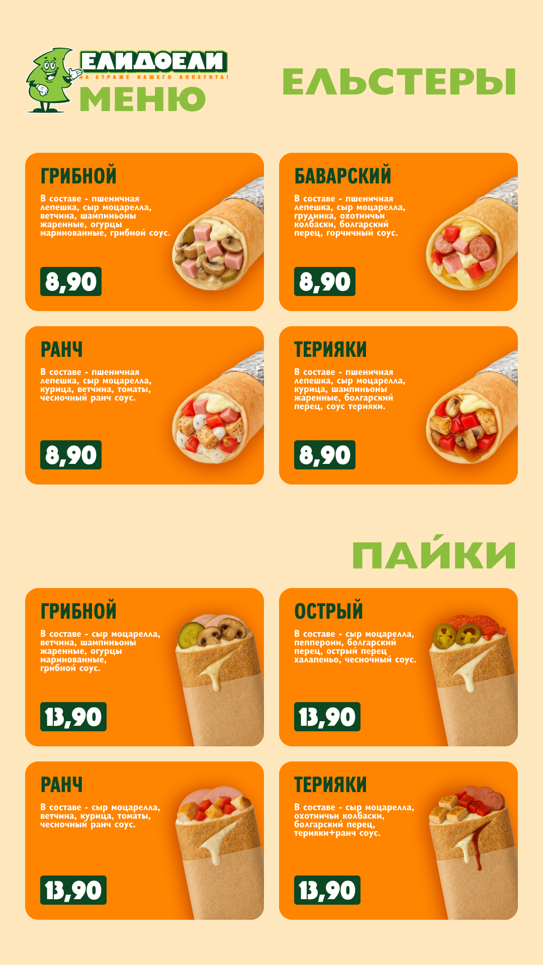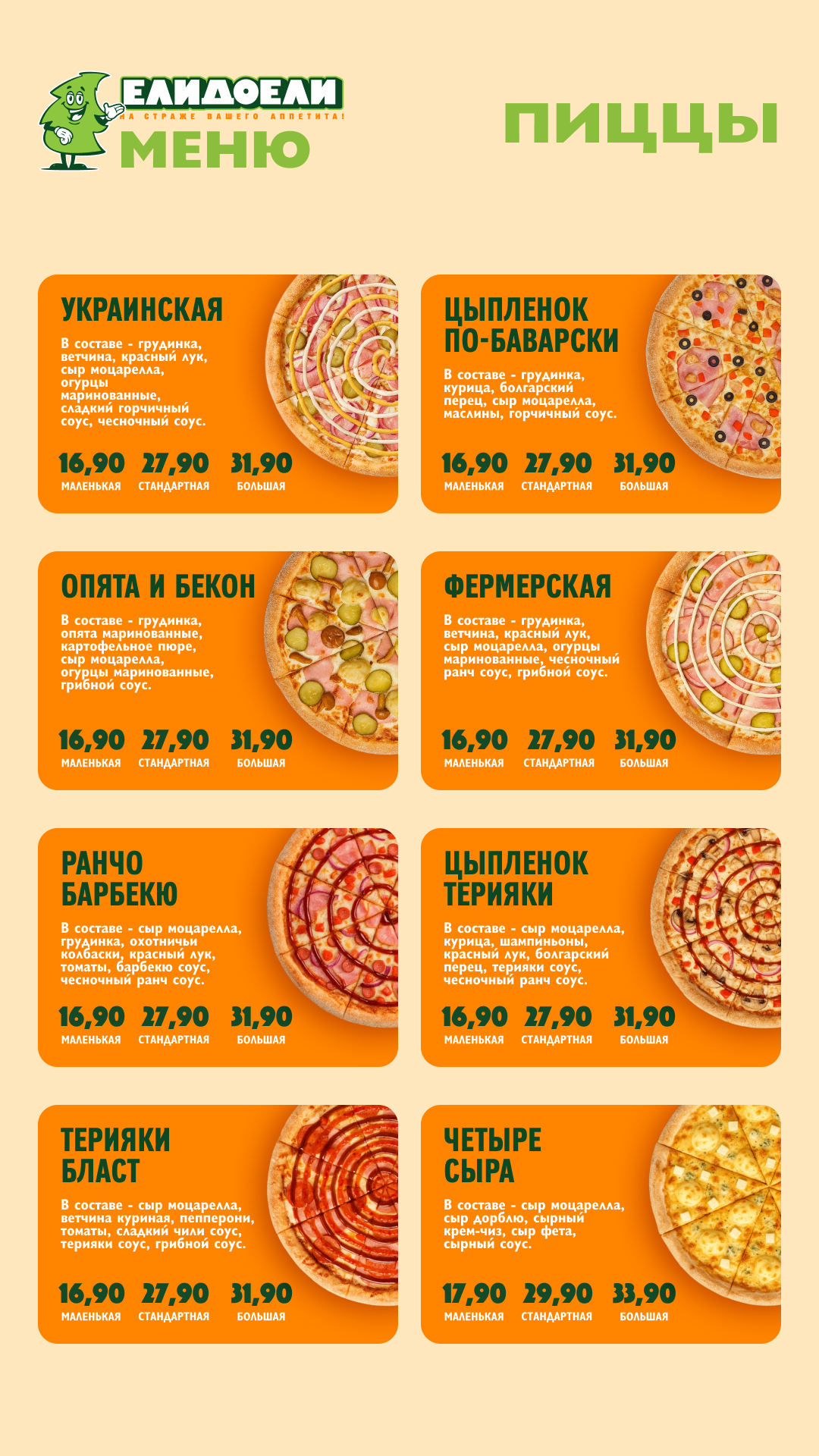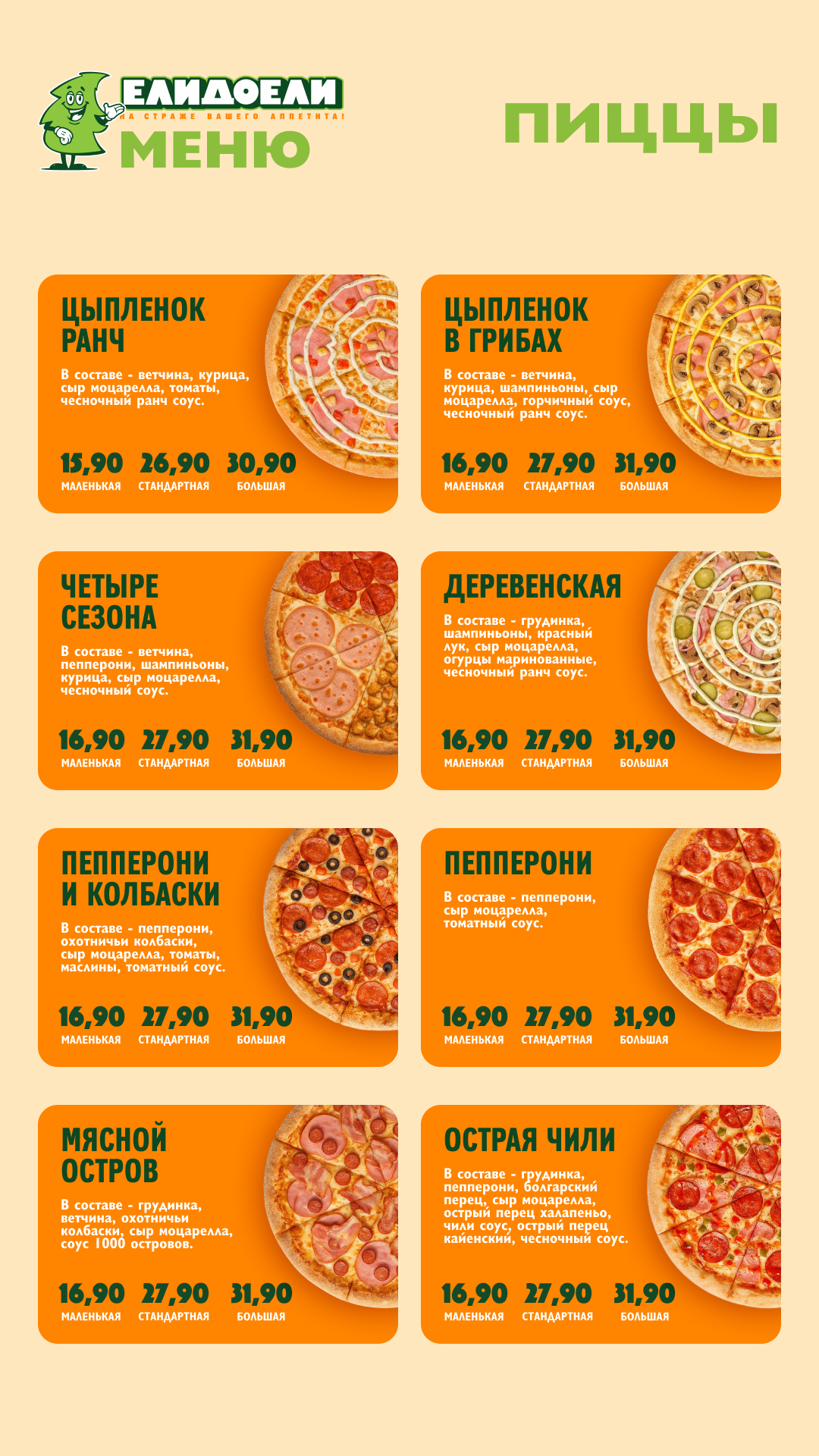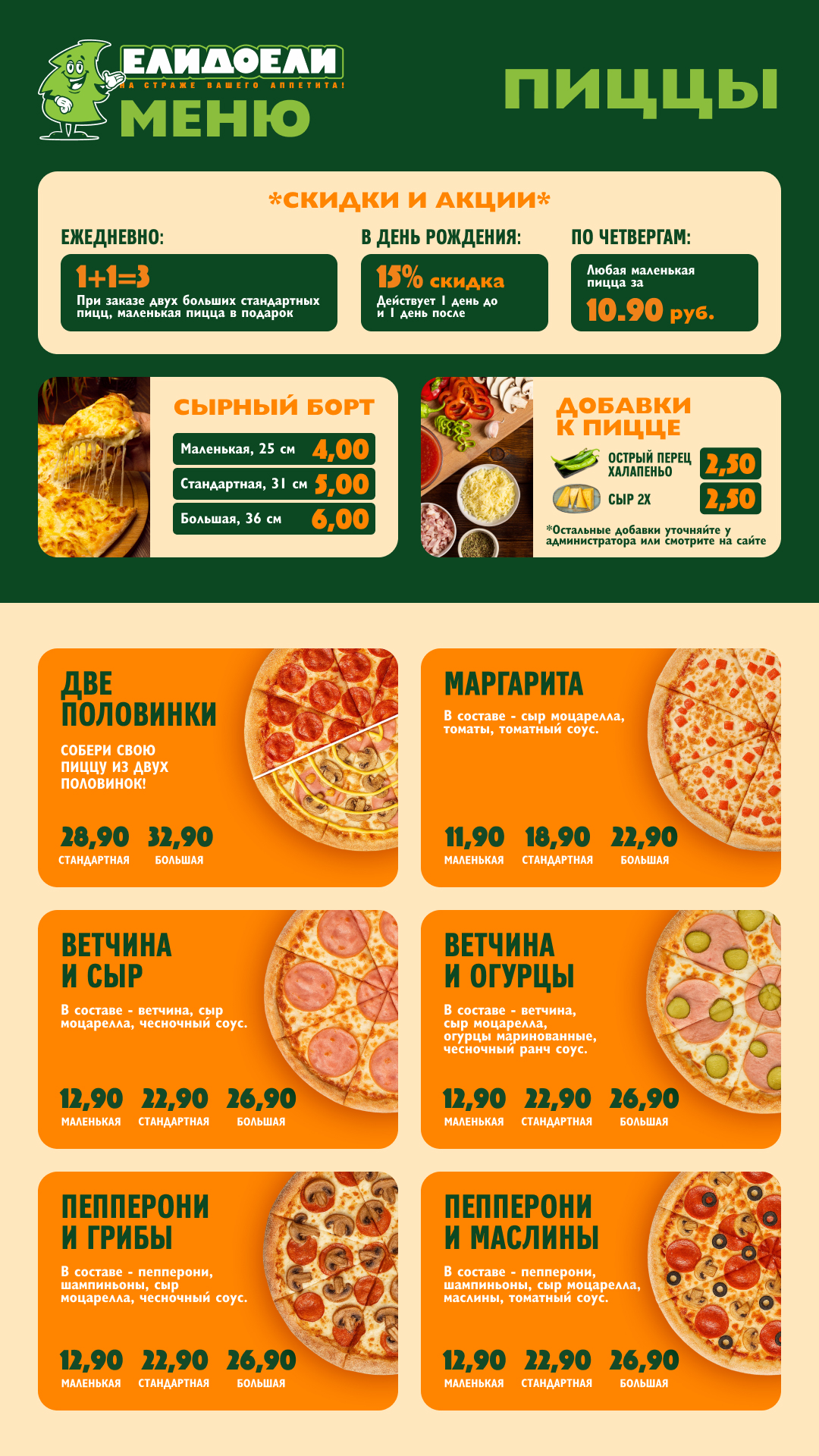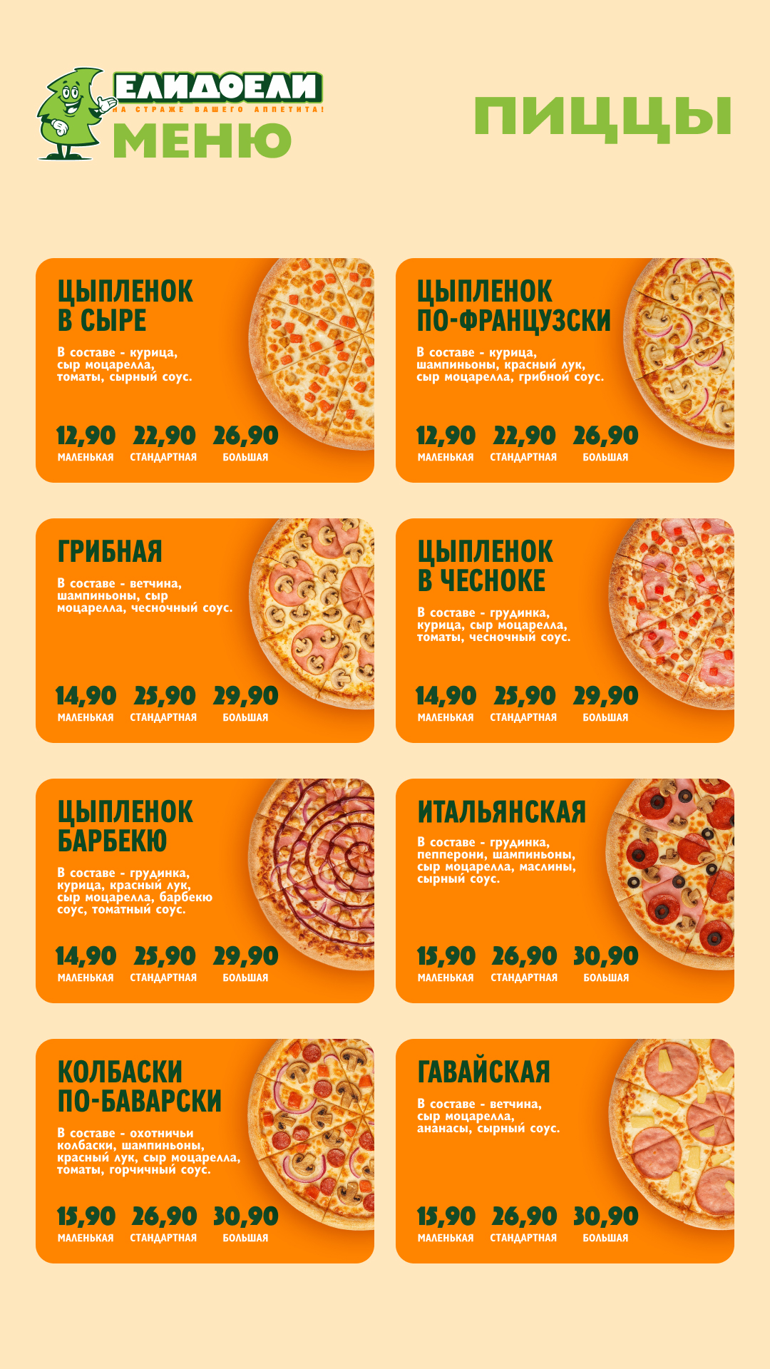 Меню для пиццерии "ЕлиДоели" в вертикальном формате под мобильный телефон