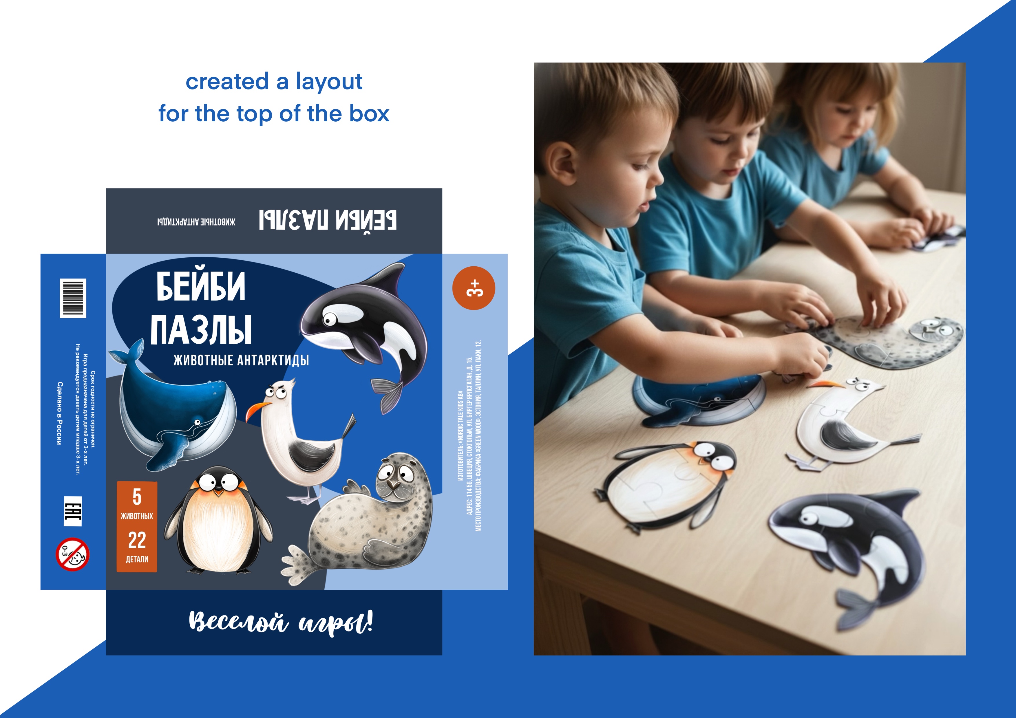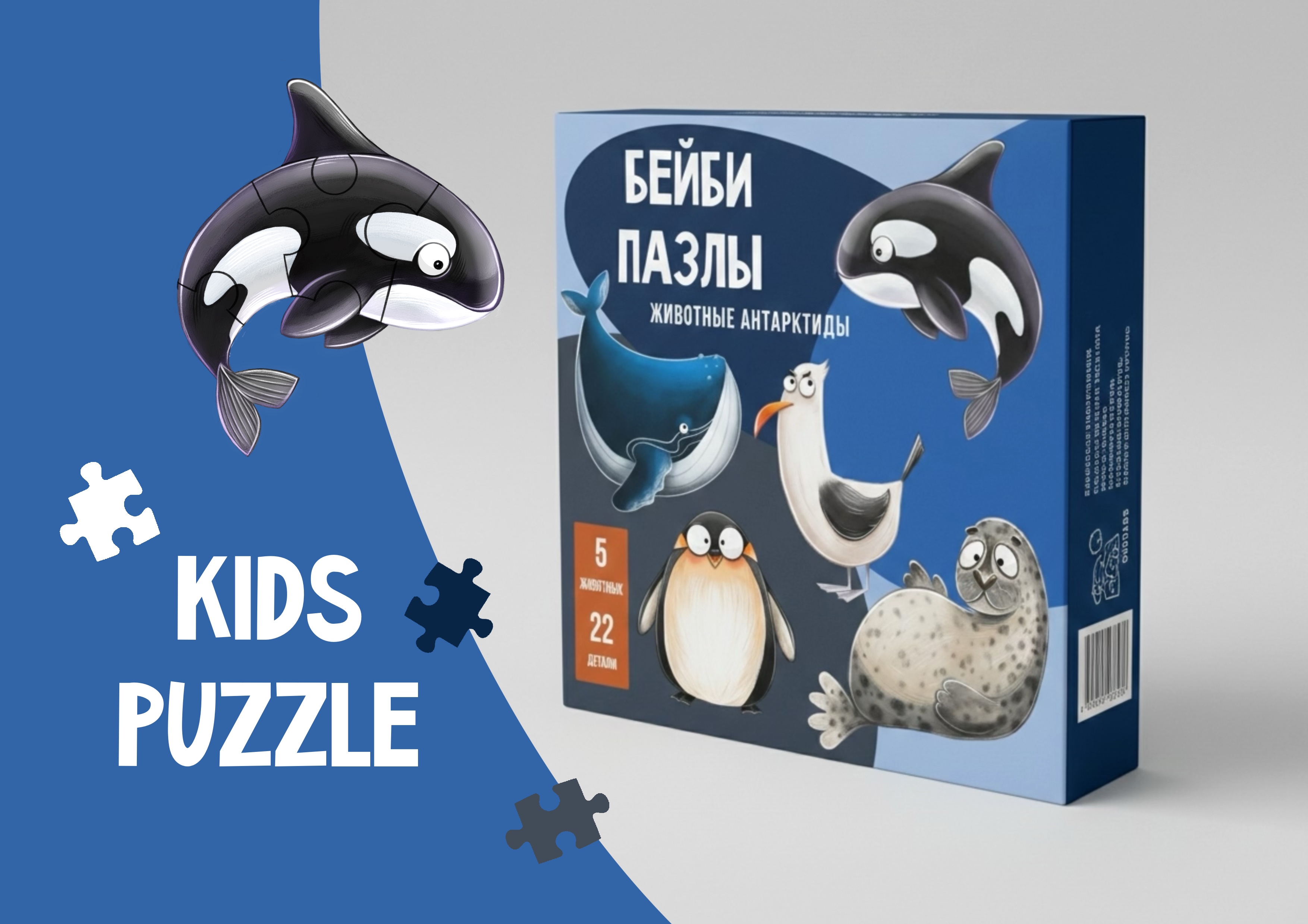 Проект детских бейби пазлов, у них крупные детали и они рассчитаны на малышей. Рассчитано на знакомство детей с животными Антарктиды