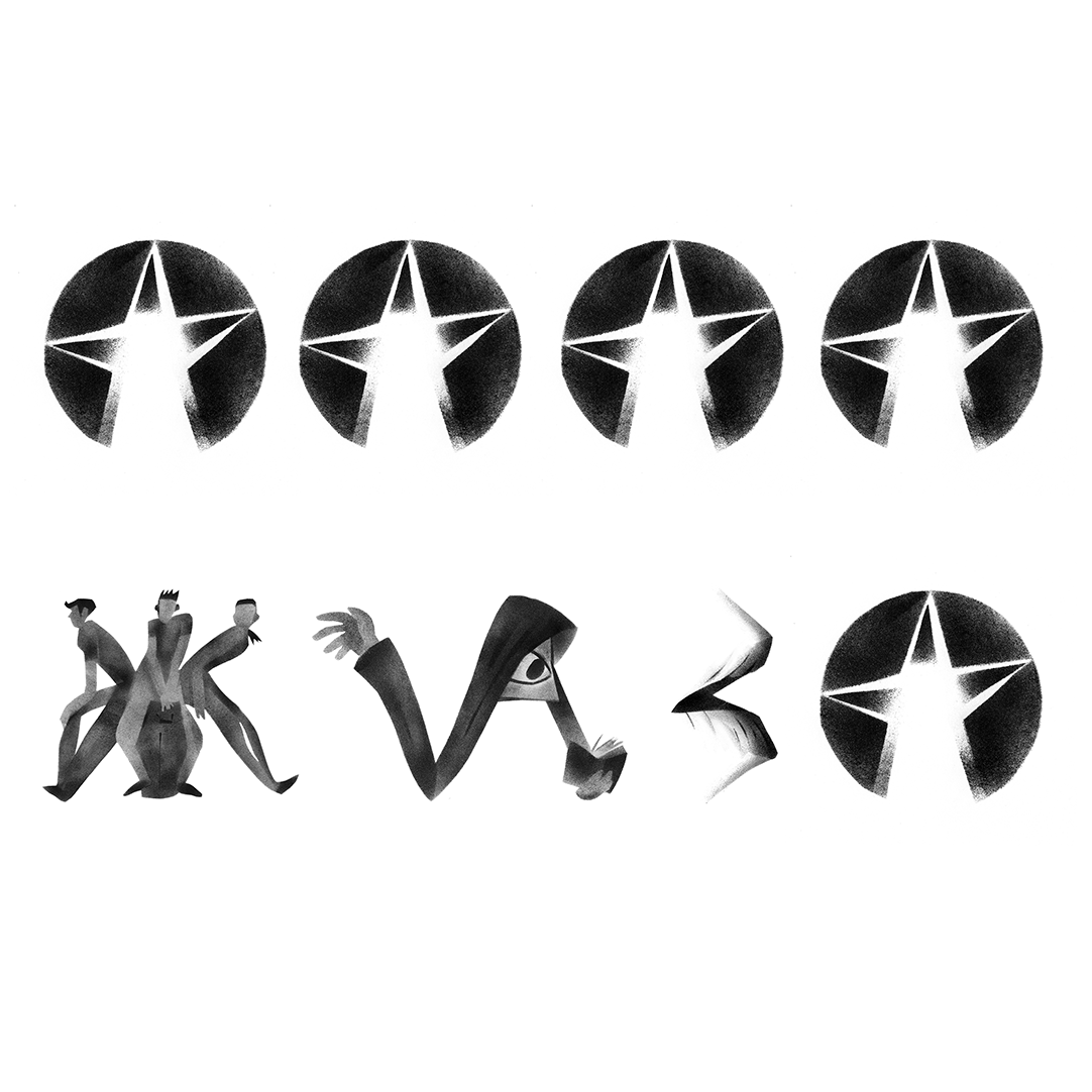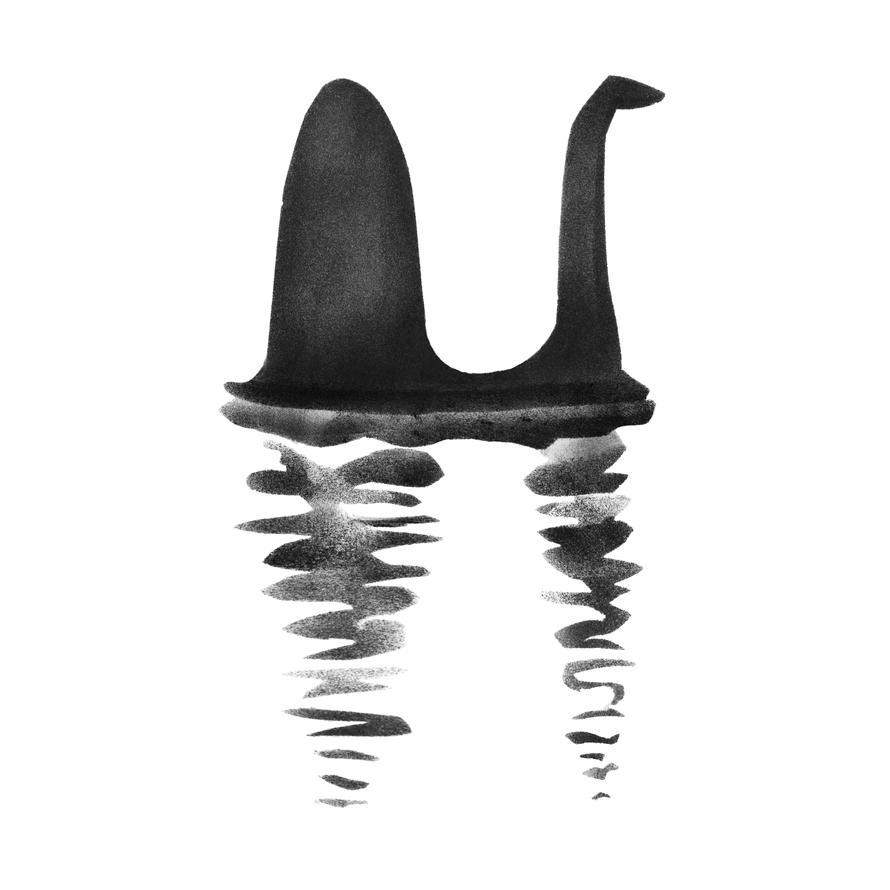 Алфавит на шуточную тему "33 НЕСЧАСТЬЯ". Буквы нарисованы в форме нестрашных неприятностей, примет или оберегов от них. Работа выполнена штемпельной краской с помощью трафарета из бумаги