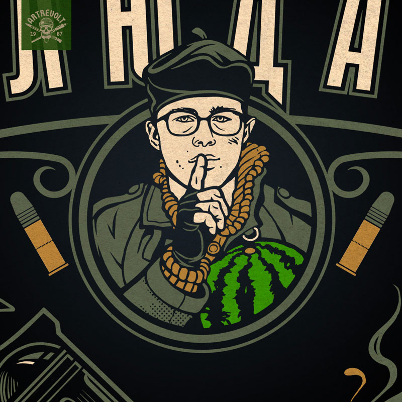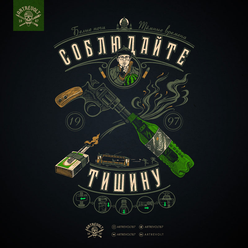 По мотивам известного фильма Балабанова. Сложной задачей было воссоздать правильно оружие главного героя, так как в кино картинка размытая, а револьвер в кадре кустарного производства. Для меня в рисовании всегда важны детали. Не просто что-то близкое по смыслу, а именно то, что должно быть нарисовано. Путем работы источниками, был найден именно тот револьвер из музея МВД.