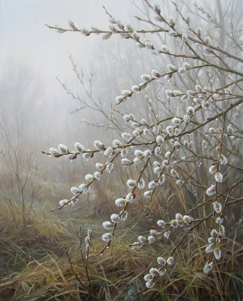 Туманный весенний день и верба в капельках
