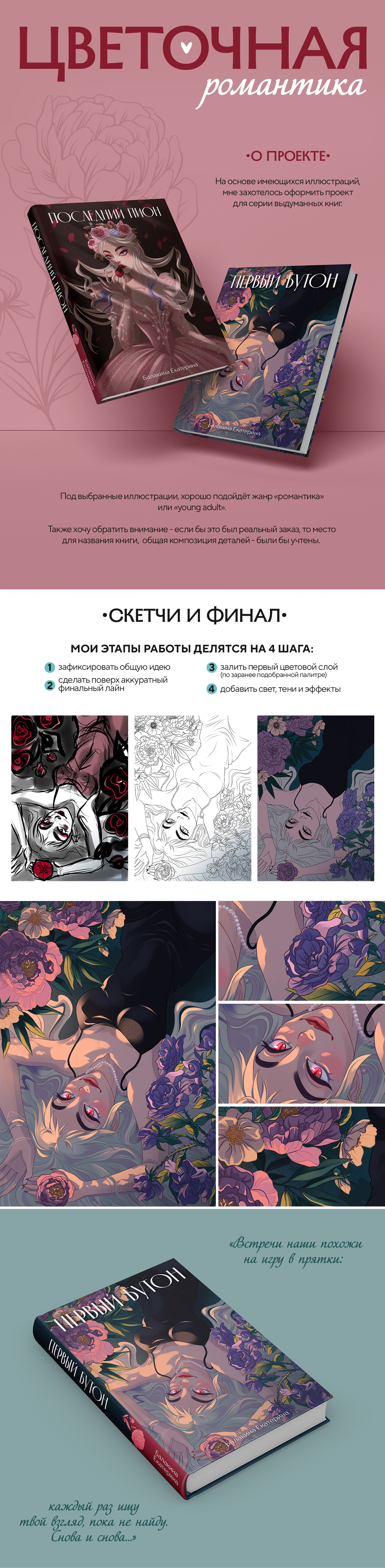 На основе имеющихся иллюстраций, мне захотелось оформить проект для серии выдуманных книг. Под выбранные иллюстрации, хорошо подойдёт жанр «романтика» или «Young adult».