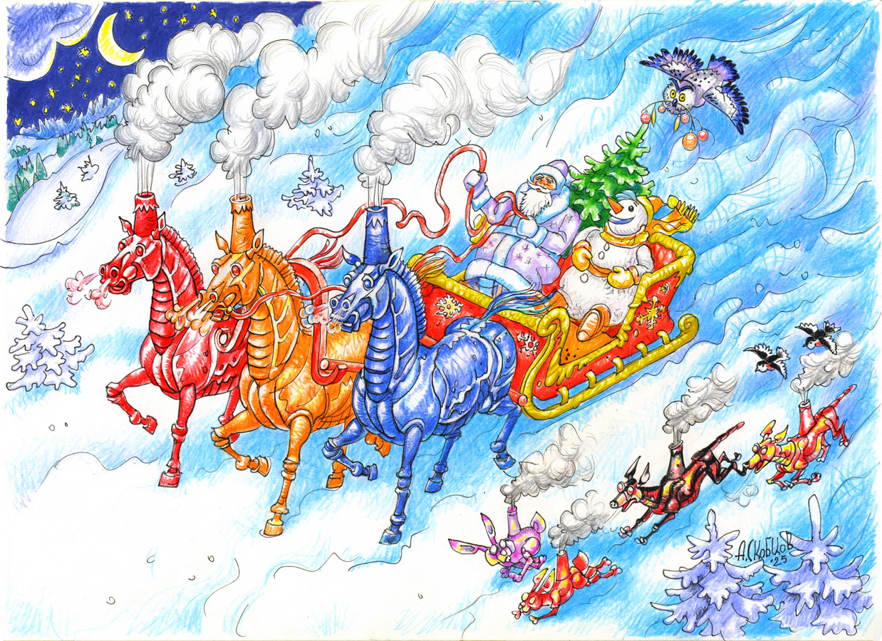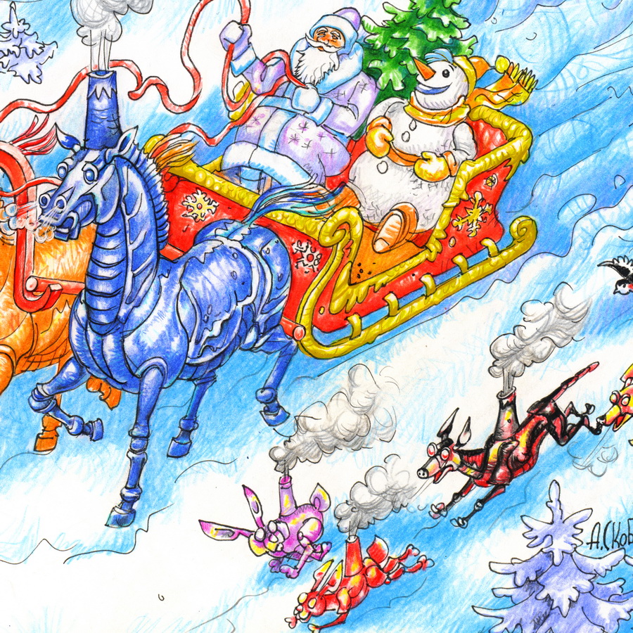 Что такое приход года огненной лошади? Пришёл к выводу, что это стимпанковская новгодняя тройка лошадей. Ставить дымовую трубу на голову деду Морозу и снеговику - перебор. Решил их пожаелеть от такого уродства.