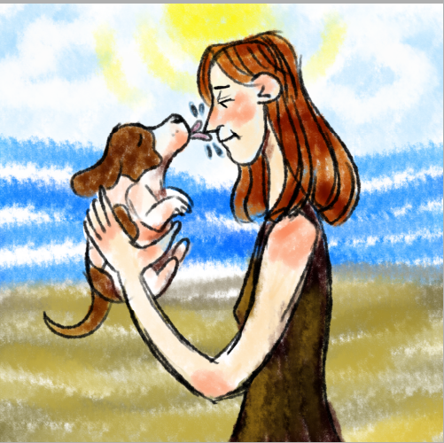 хозяйка с собачкой на пляже