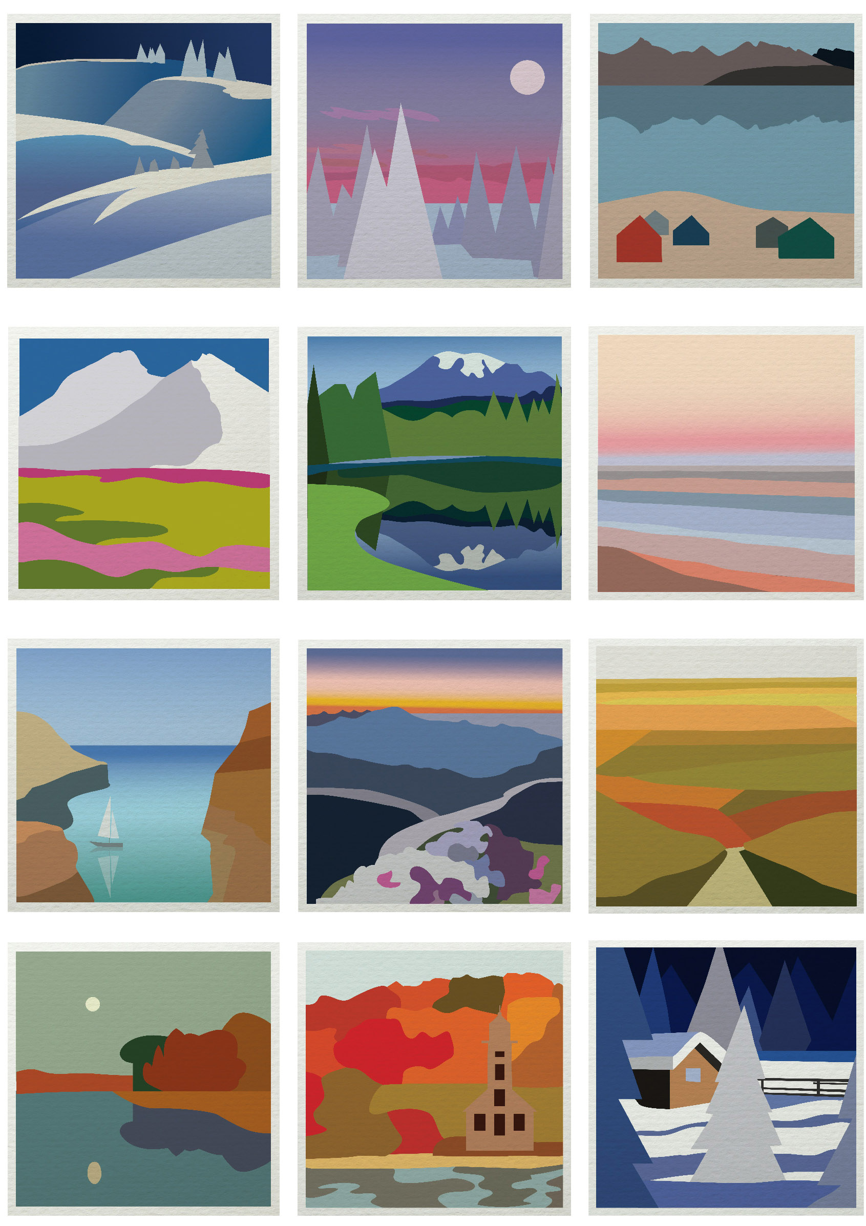 Иллюстрации пейзажей в минималистичном стиле для календаря.