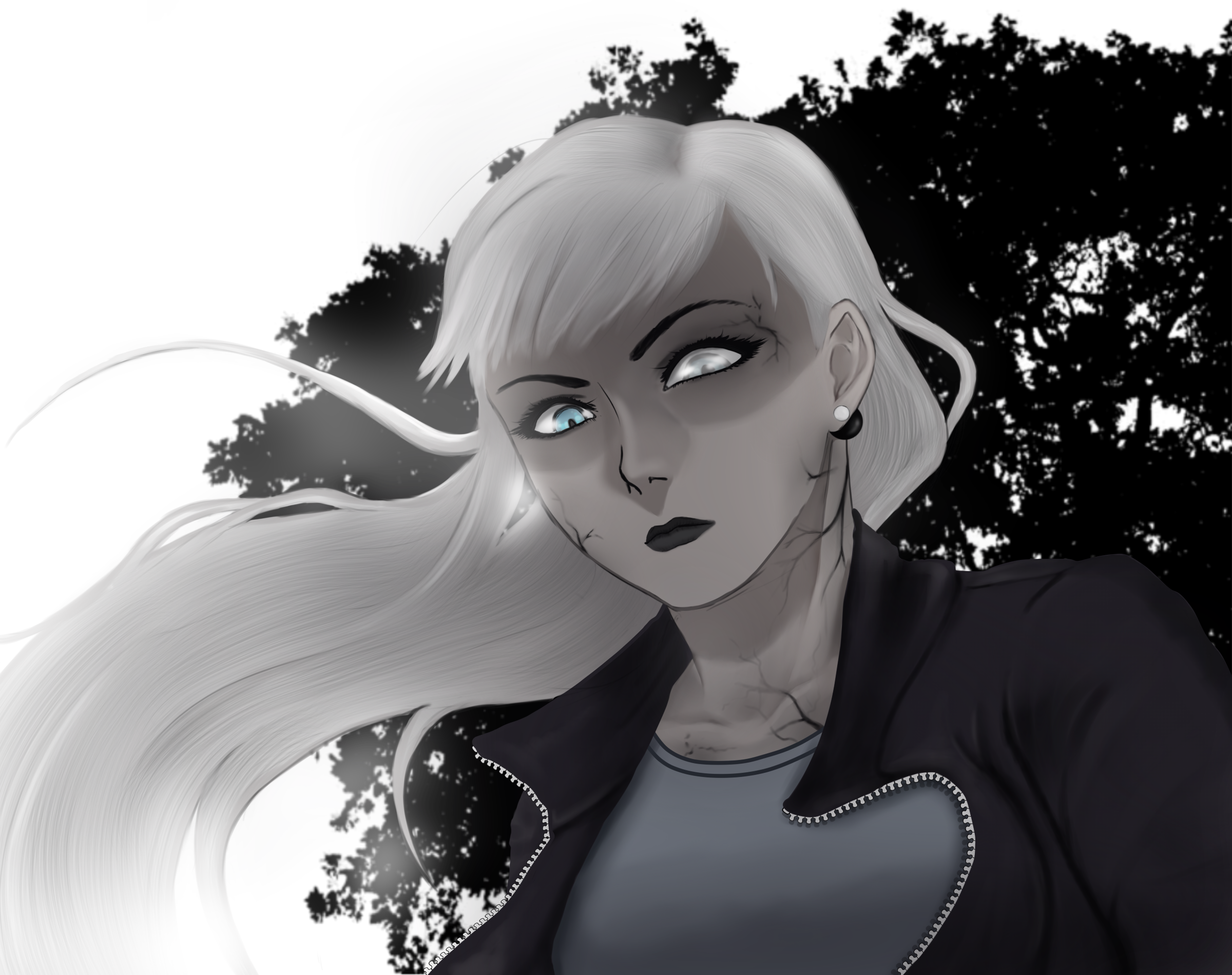 Николь. Мой персонаж. Является зараженной особым вирусом без потери сознания и личности. Любит носить черный спортивный костюм, платиновые волосы достают до колена, один из голубых глаз слегка застлан пеленой. По всему телу видны черные вены, кожа нездорового цвета.