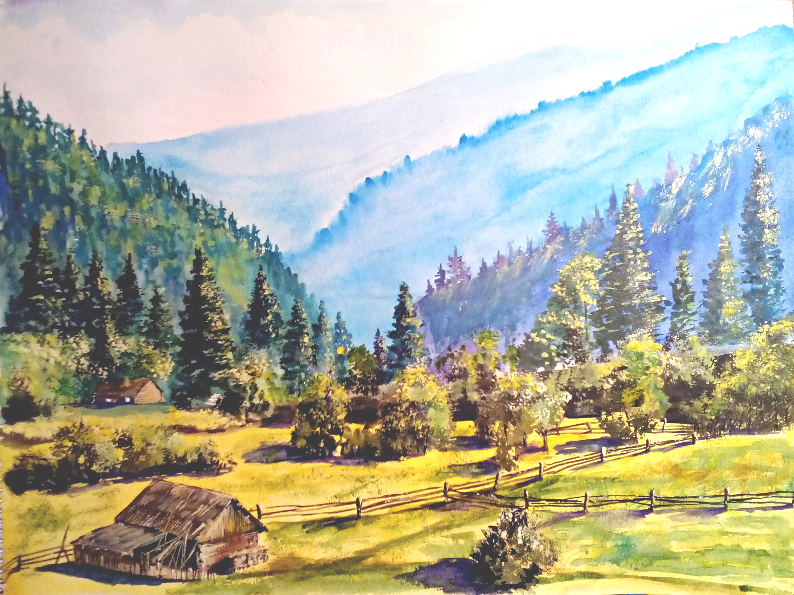 Селение в карпатских горах. Я рисовал на ватмане акварелью.