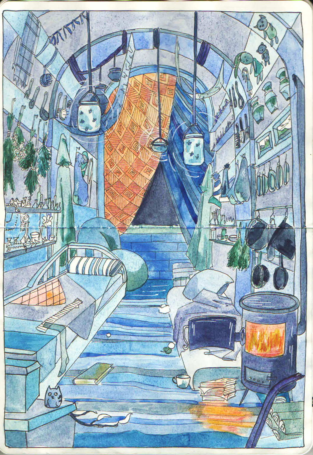 Иллюстрация на тему "Место жительства персонажа". Передвижное жилище травника изнутри