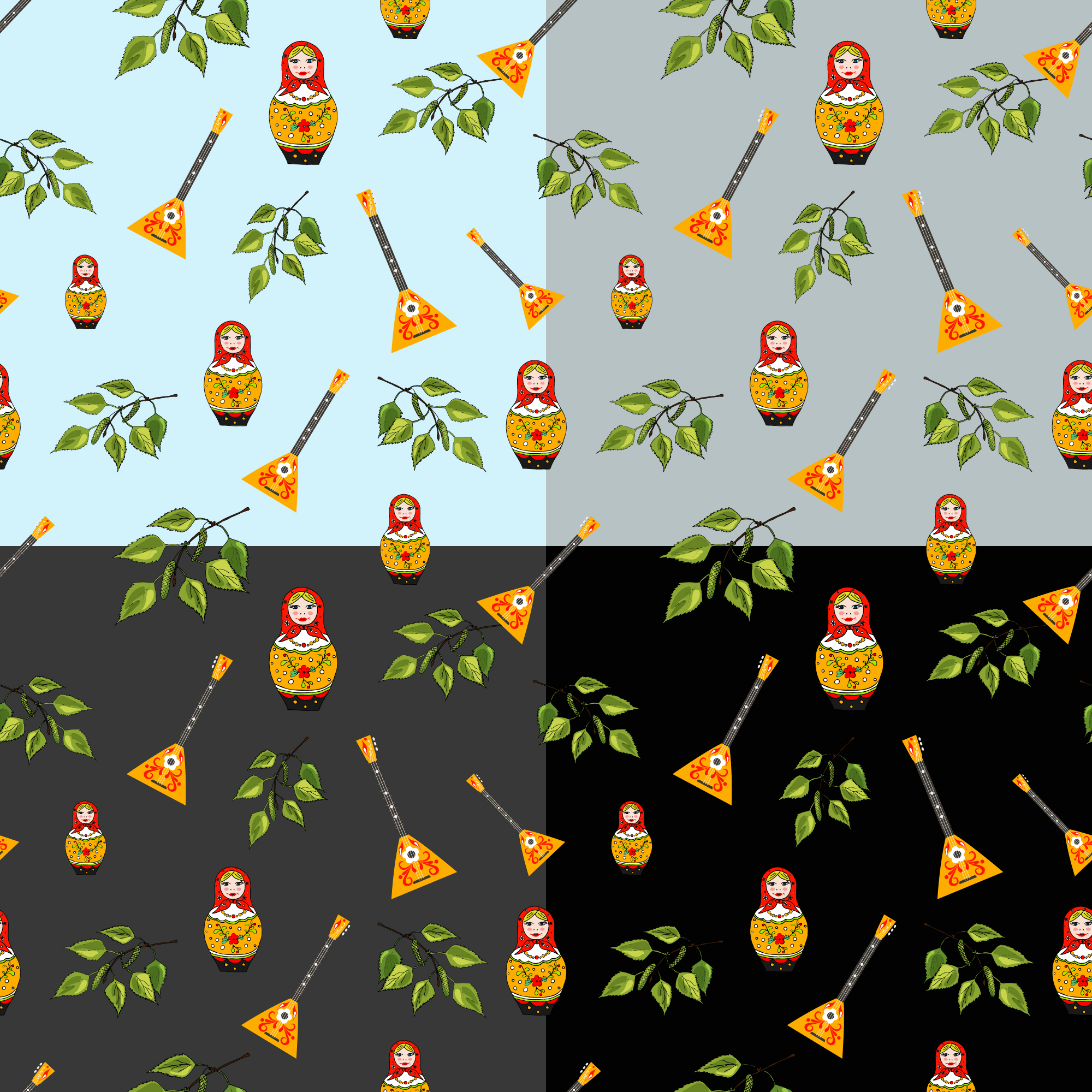 Бесшовный паттерн с русскими символами ( берёза, матрёшка, балалайка)