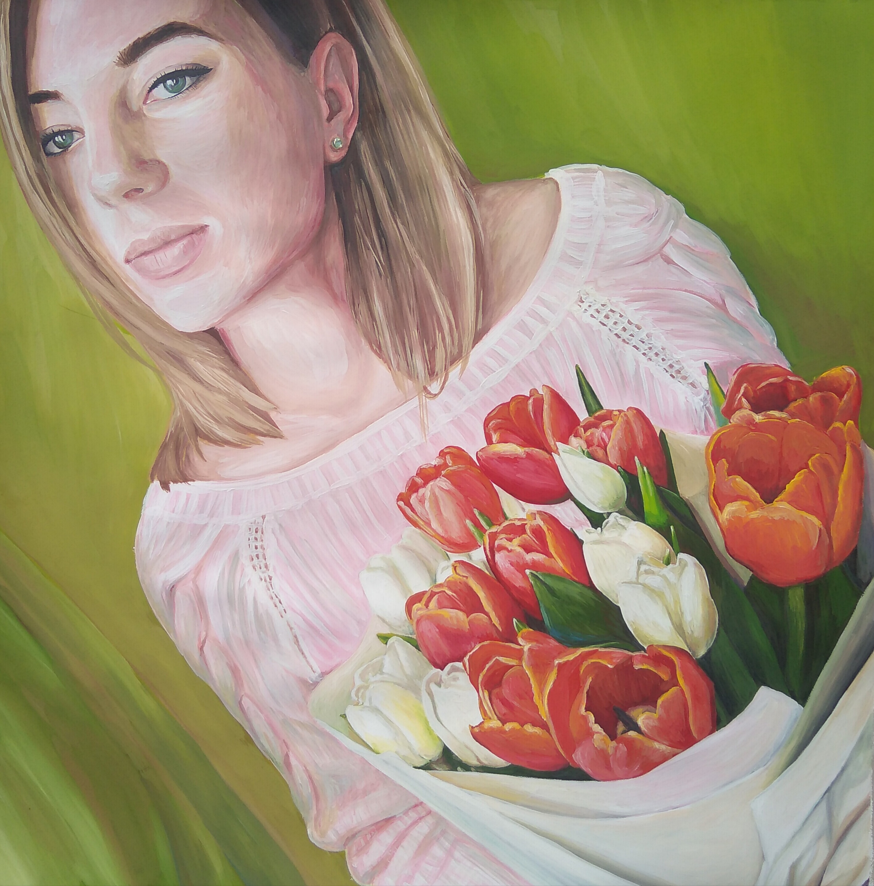 Портрет девушки с цветами, нарисован гуашью на А2 формате