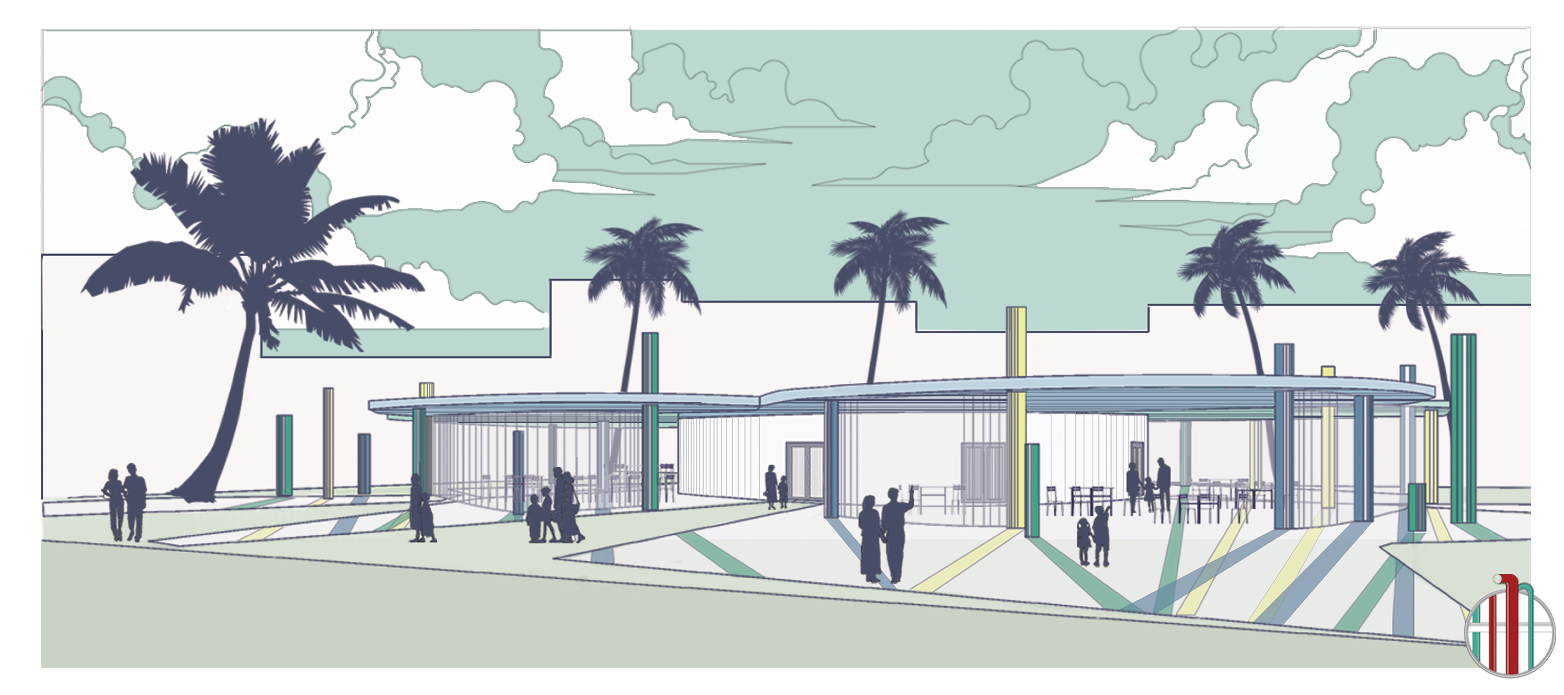 Концептуальный проект кафе в Майями. Представлен экстерьер и интерьер