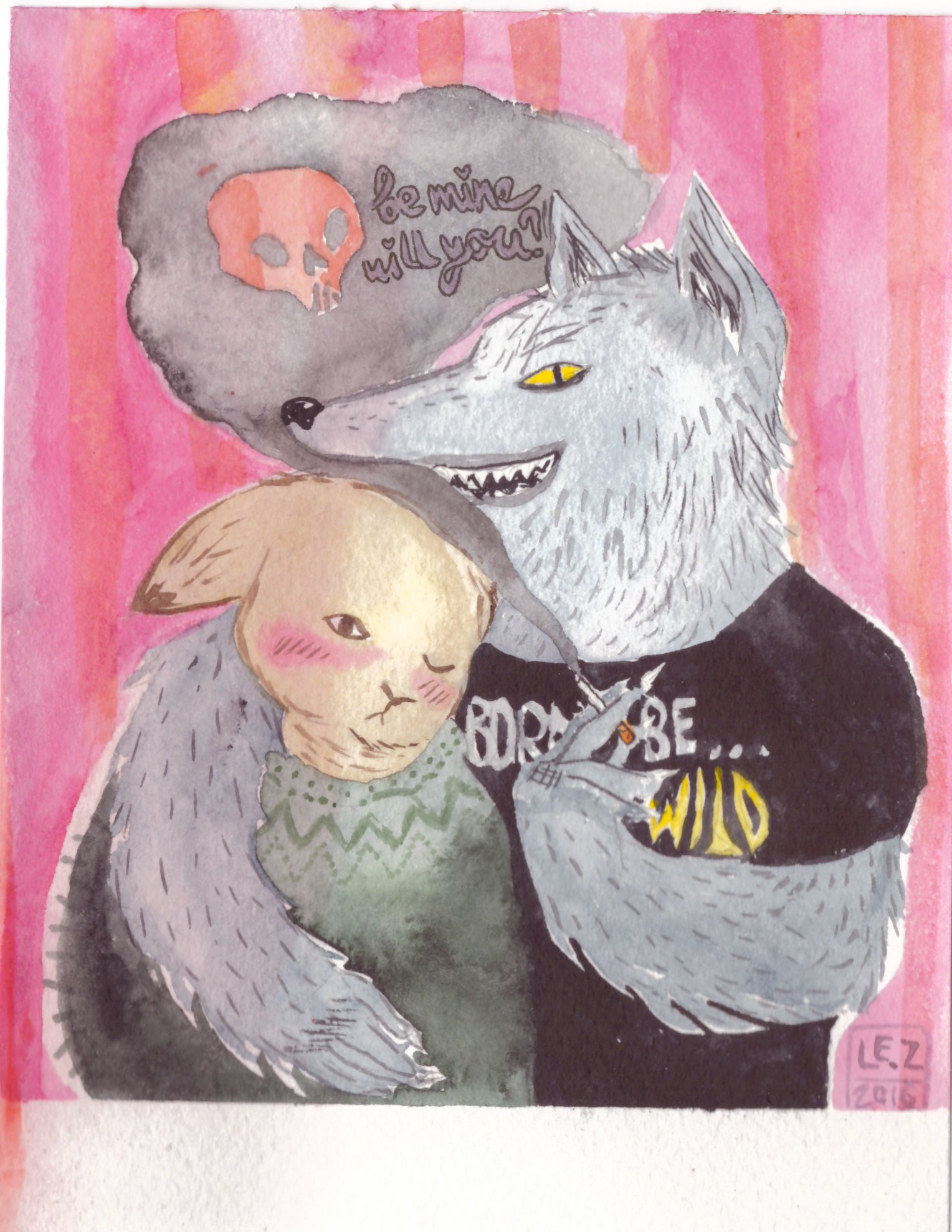 Первая иллюстрация из серии работ об отношениях двух молодых людей. Изображение формата А5, выполненное в акварельной технике с использованием цветных карандашей.