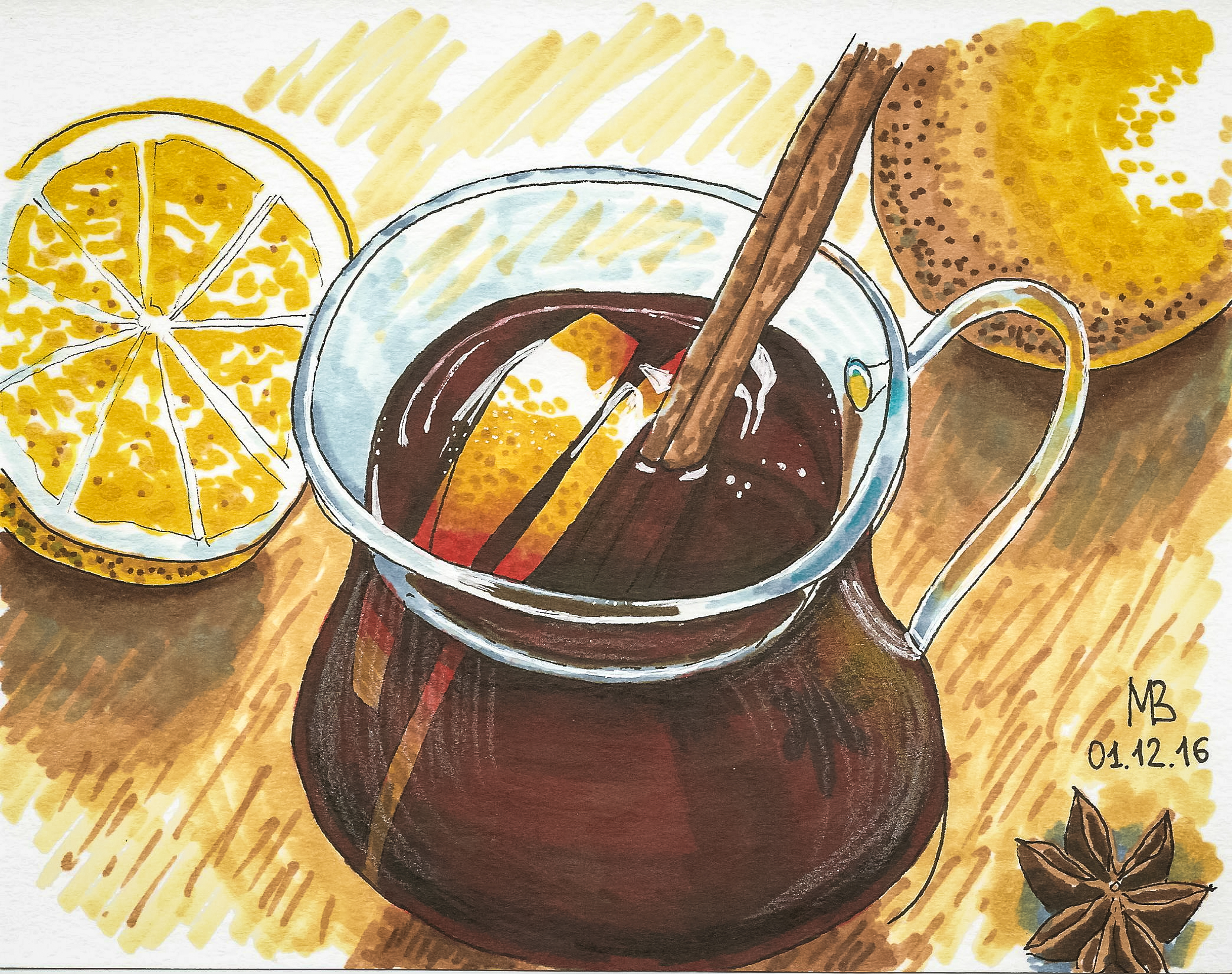 Графин с глинтвейном и апельсинами (спиртовые маркеры)
