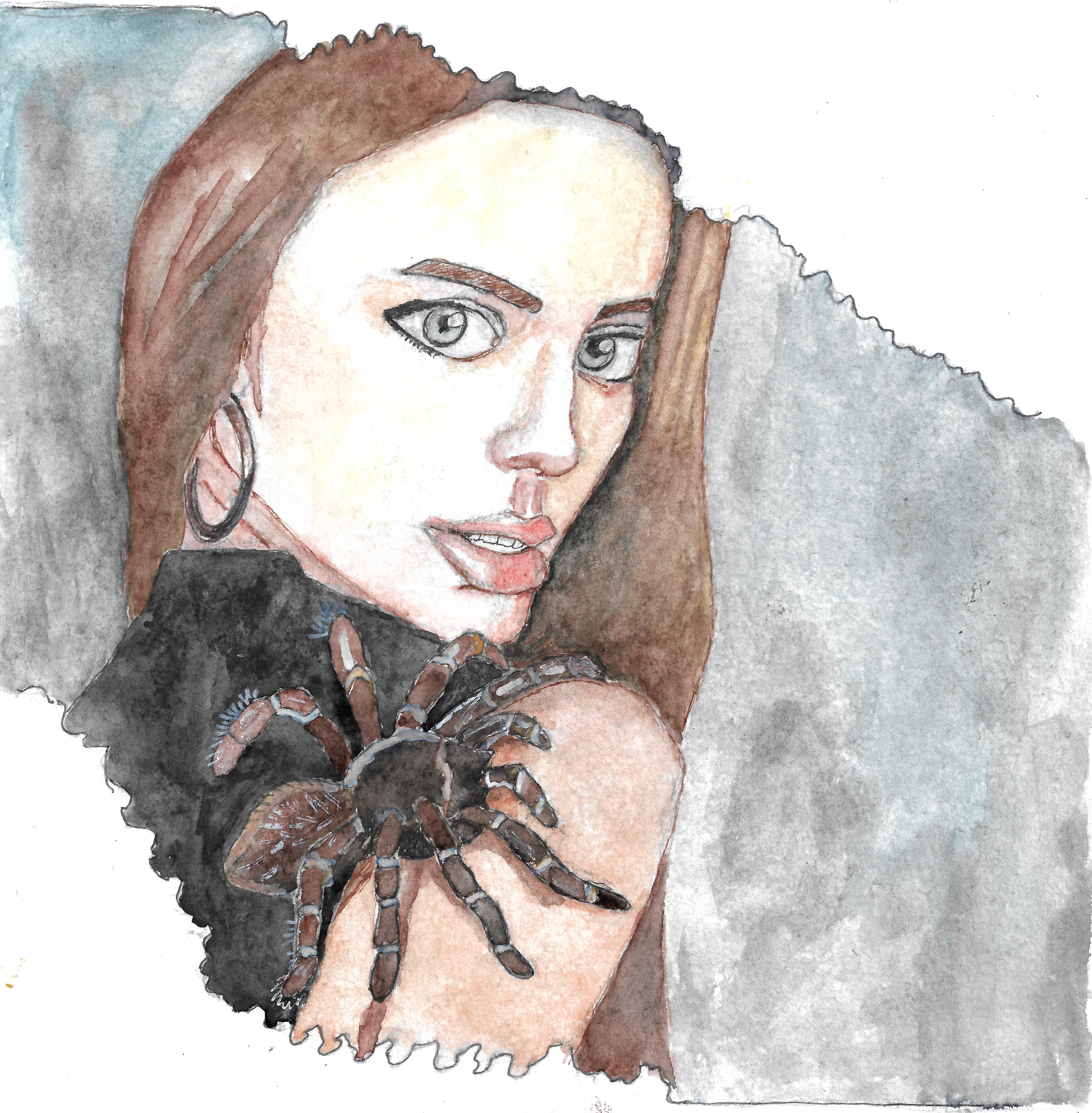 Портрет девушки с большим мохнатым пауком на плече.