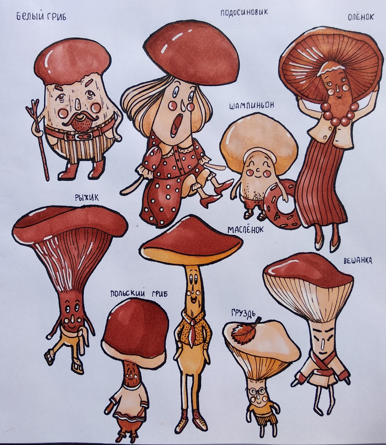 Персонажи на основе грибов. Работа выполнена лайнером и маркерами.