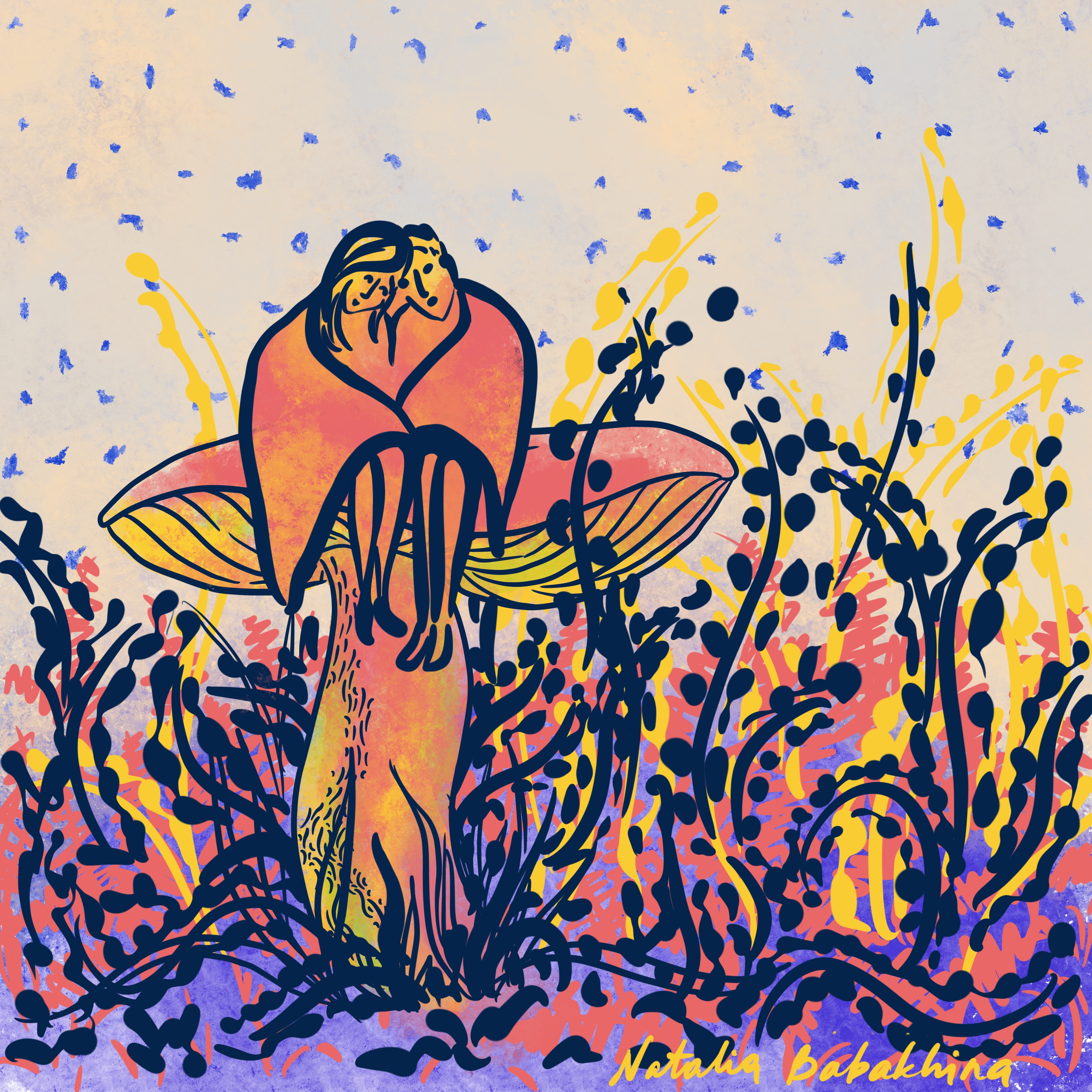 Графичная иллюстрация про вместе под звёздами. Парочка на свидании сидит на гриле и шепчется о самом важном.