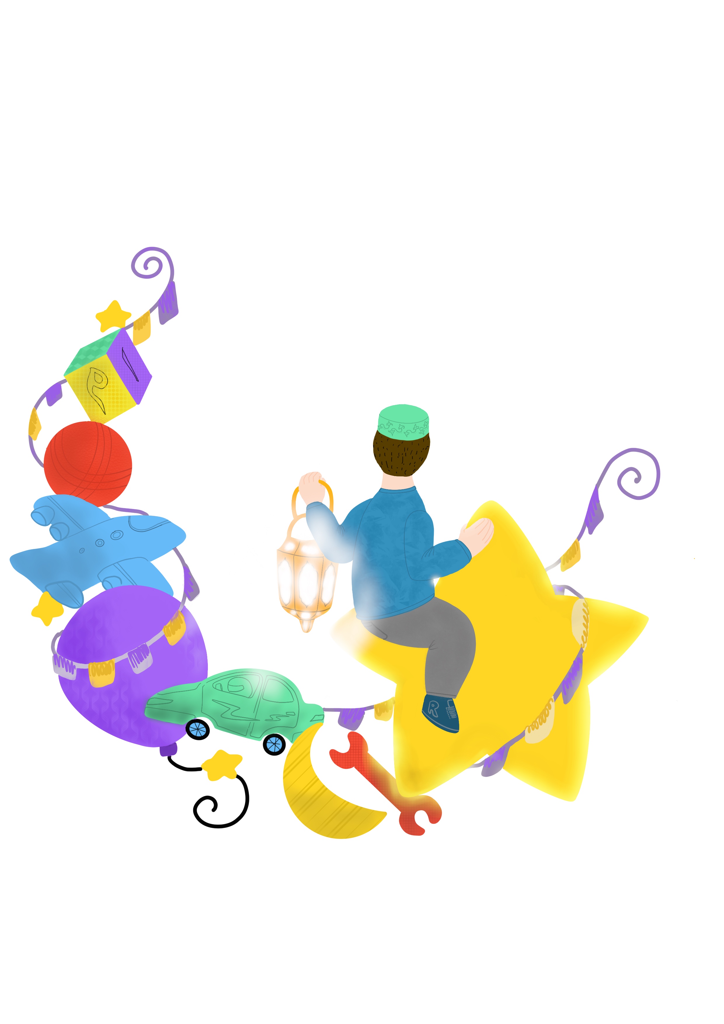 Мальчик на звезде с гирляндой из игрушек.