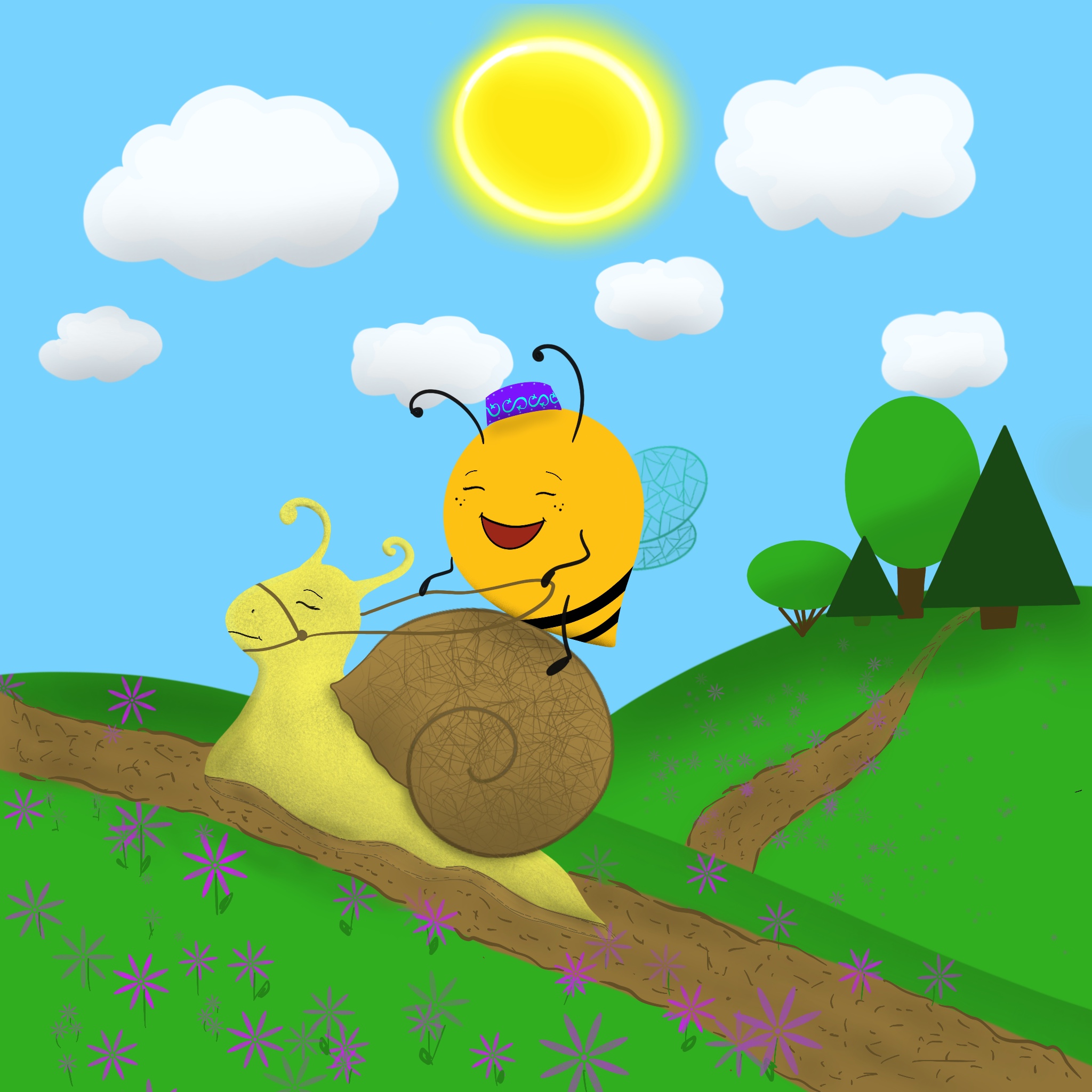 Пчела катается на улитке на фоне лесной опушки, персонажи для детской исламской книги