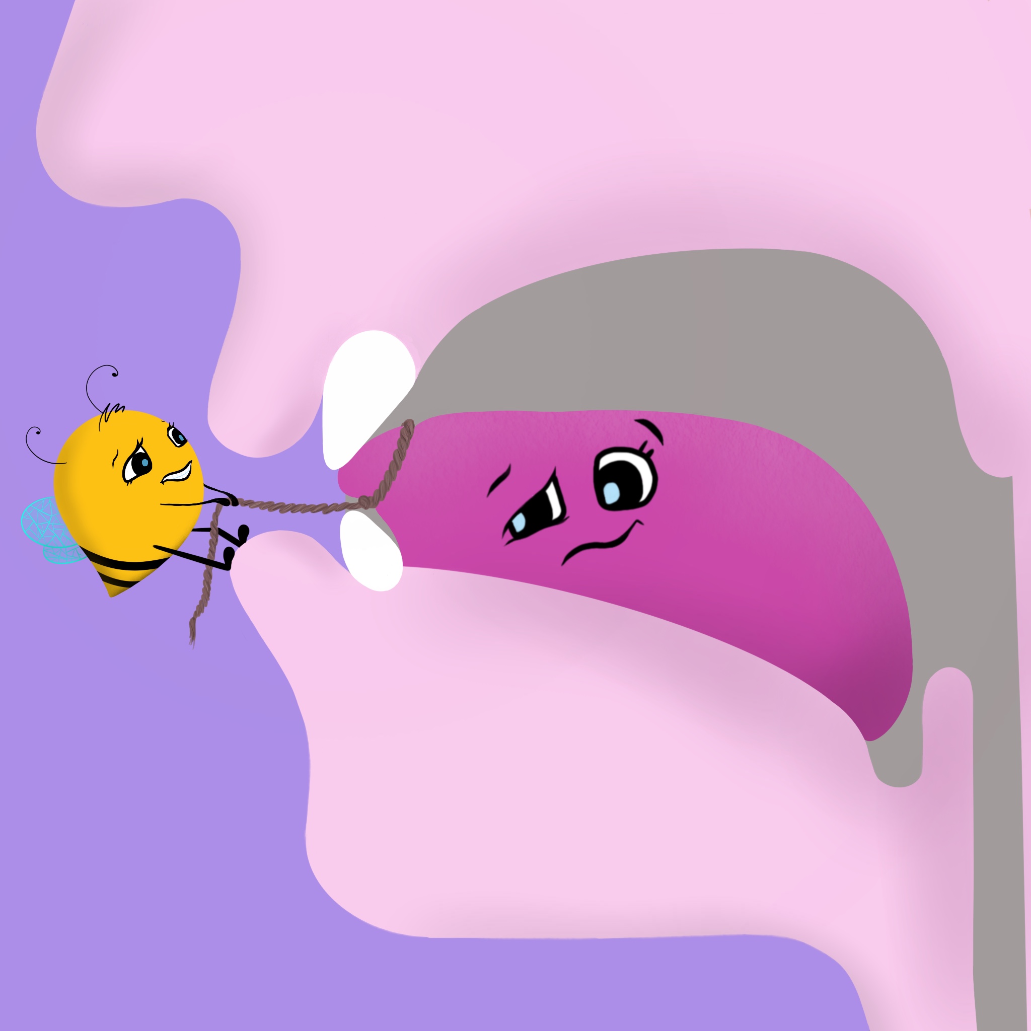 Иллюстрация для детской книги по логопедии, где пчела помогает понять как должен произноситься звук, пчела тянет язык