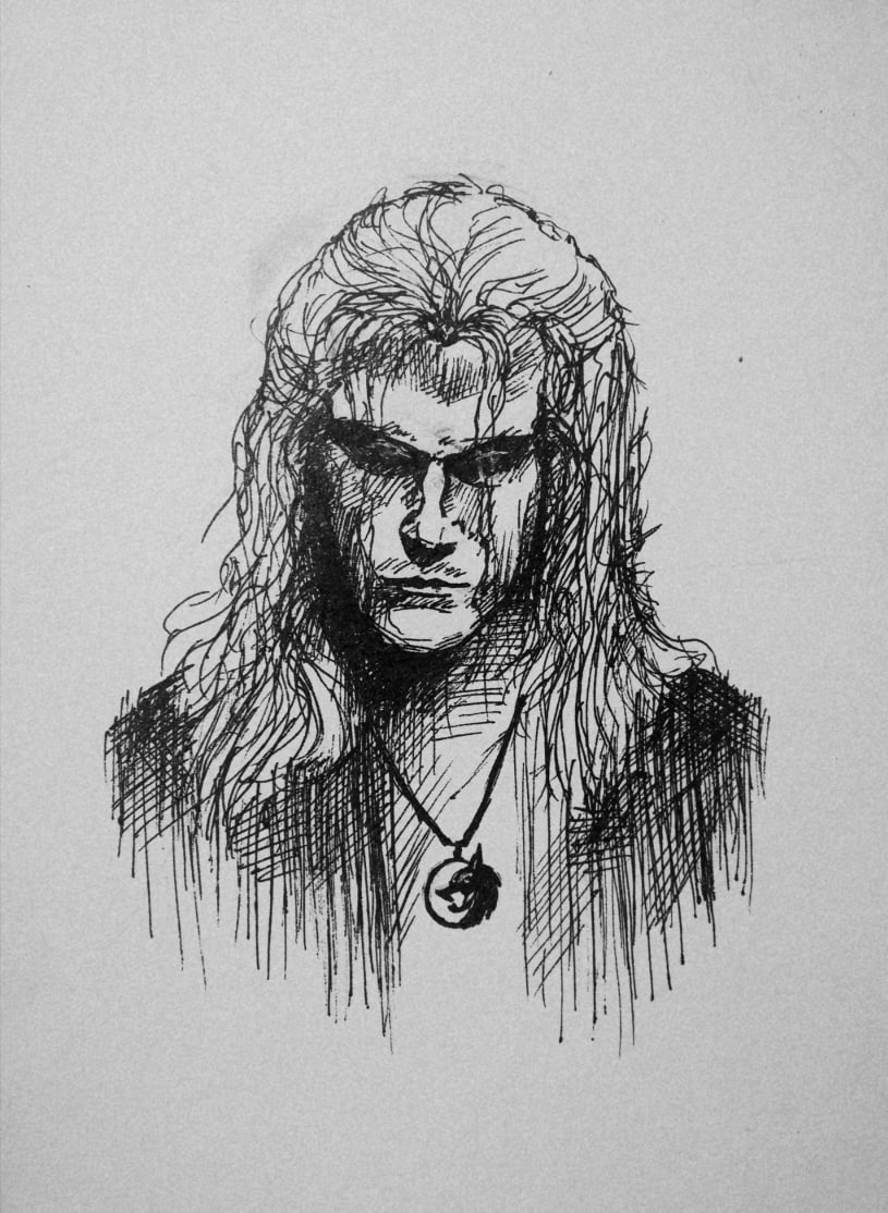 Портрет всем известного гг из нового сериала "Ведьмак"/"The witcher".Рисунок выполнен простой чёрной гелевой ручкой.