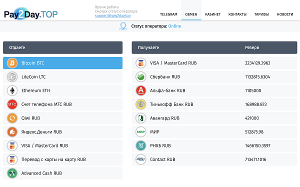 Если вы почитаете в интернете отзывы и мнения пользователей об этом ресурсе, то увидите, что они, прежде всего, ценят оперативность и простоту обмена. Также к положительным моментам следует отнести и выгодный курс. Для проведения операции нужно заполнить специальную форму и отметить, что вы отдаете и что хотите получить. К примеру, в поле «Отдаете» выбираете вариант: «Счет телефона МТС», а в поле «Получаете» - Bitcoin. После оплаты заявки пользователь перенаправляется на страницу «Состояние заявки», где можно будет отследить статус перевода. Если вас интересует обмен visa на bitcoin https://pay2day.top – это то, что вам нужно!