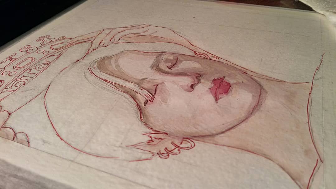 Материалы смешанной техники: акварель, красная шариковая ручка, пастель.