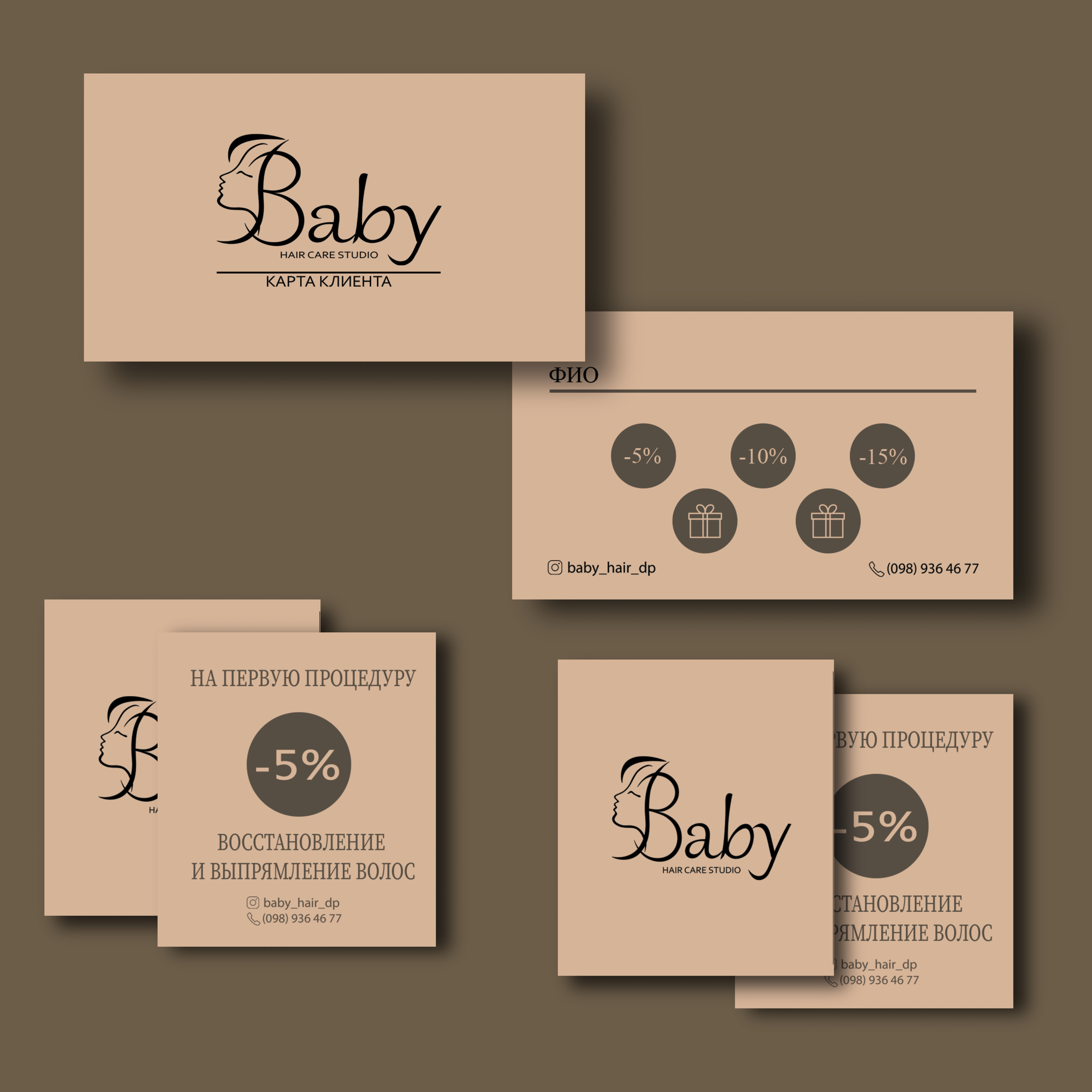 Логотип создан под студию по уходу за волосами. Визитка (карта клиента) с посещениями, так же фишки со скидками для близких
