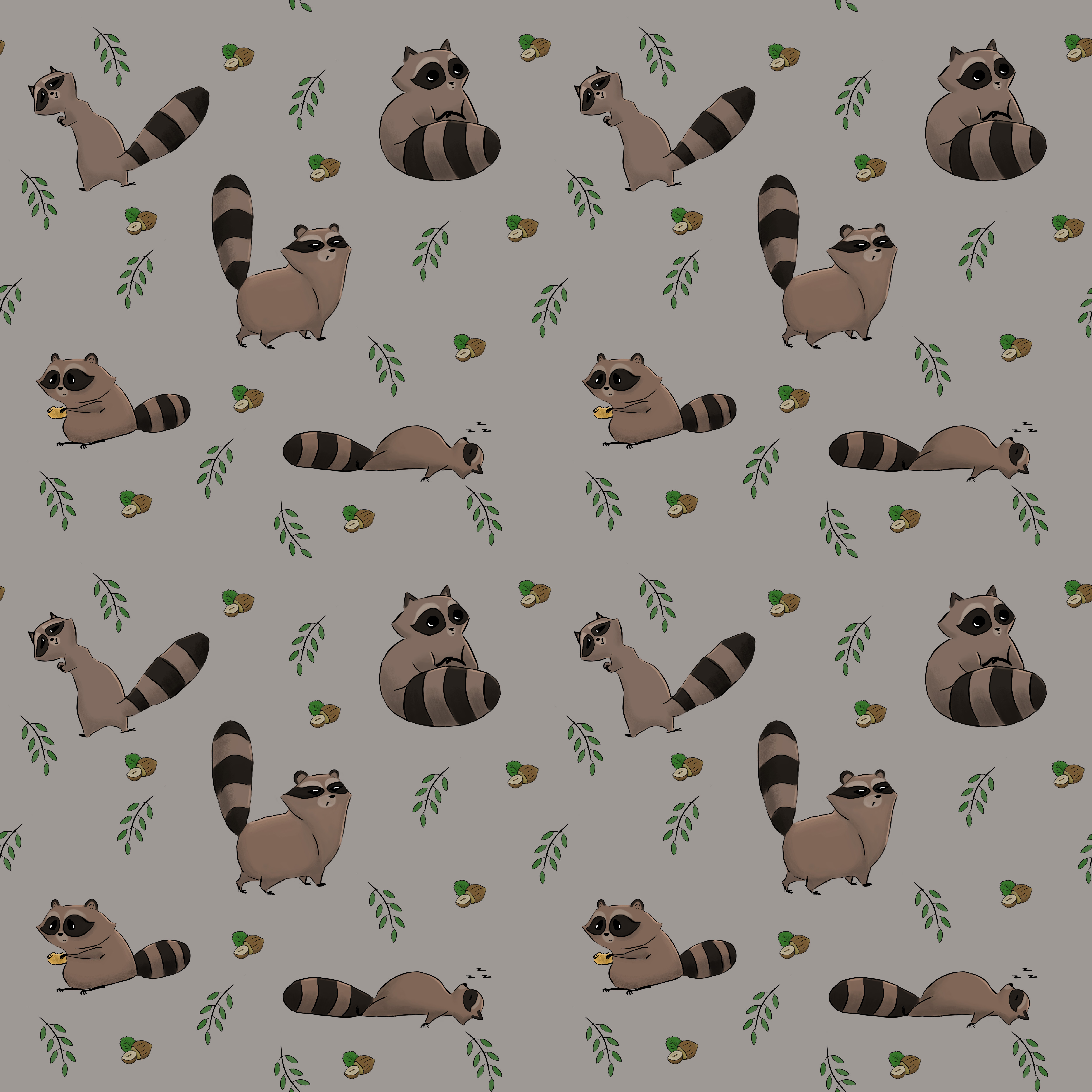 Бесшовный паттерн с енотами и орехами на сером фоне