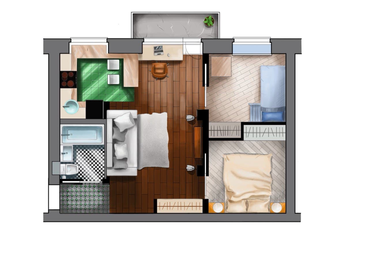 Планировка квартиры (вид сверху) с объёмом и тенями
