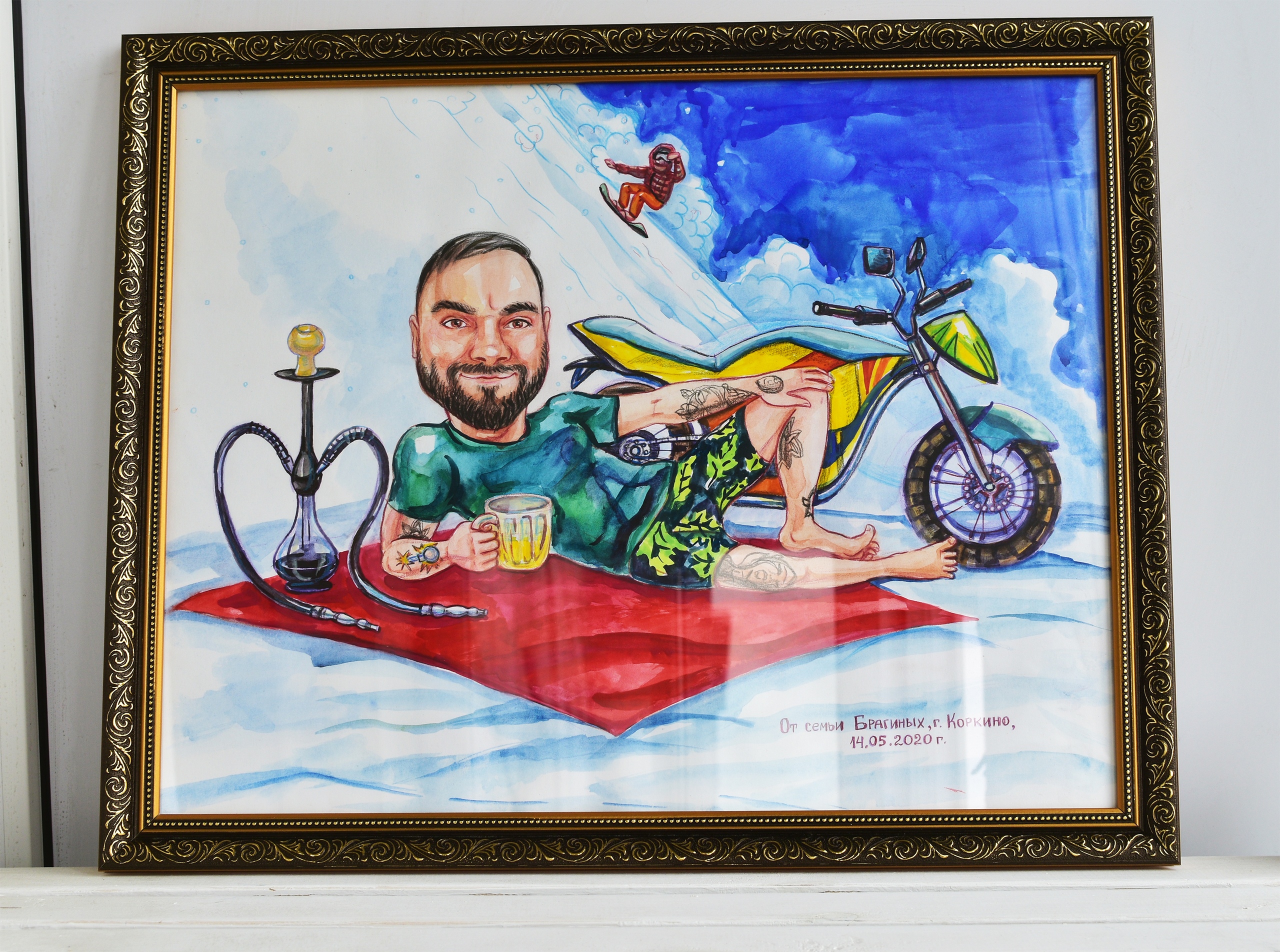 Шарж по фото на мужчину с кальяном и мотоциклом