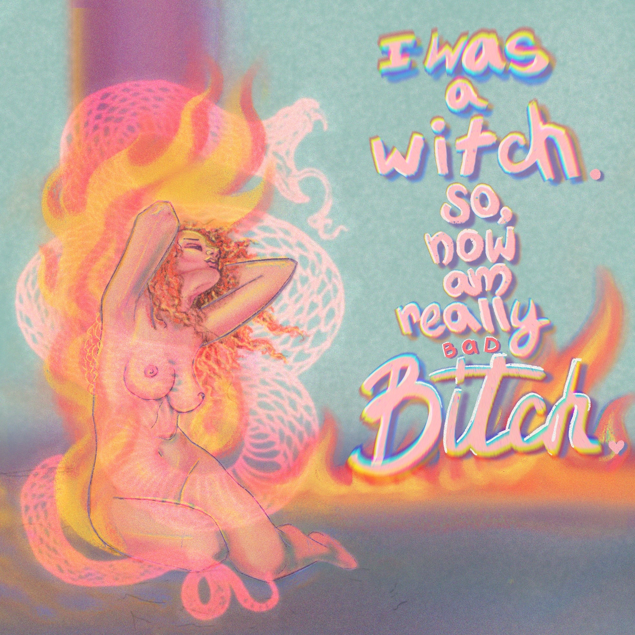 Помните историю про сжигание ведьм? Надпись на рисунке «я была ведьмой, так что теперь я реально плохая с7к@