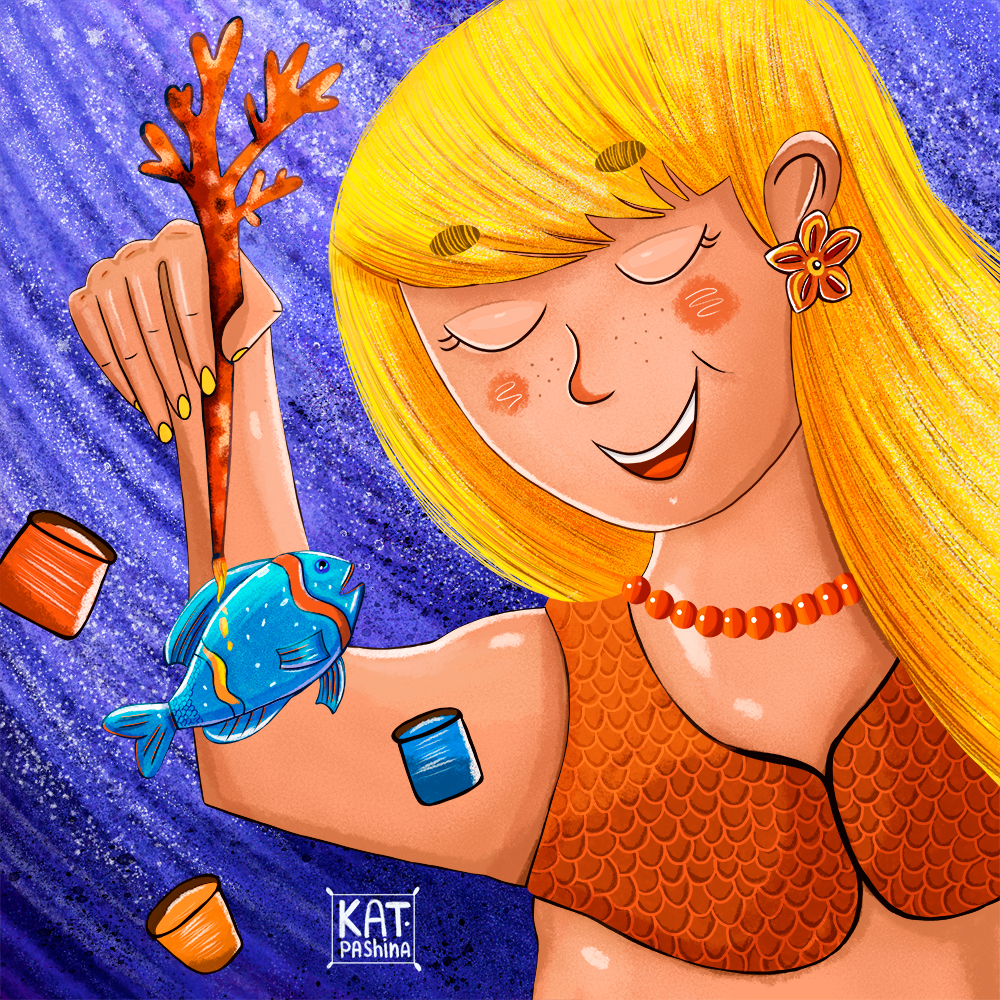 Русалка Ева, для детской книжке о морском мире. Ева раскрашивает рыбку, показывая этим все разнообразие цветов морского мира.