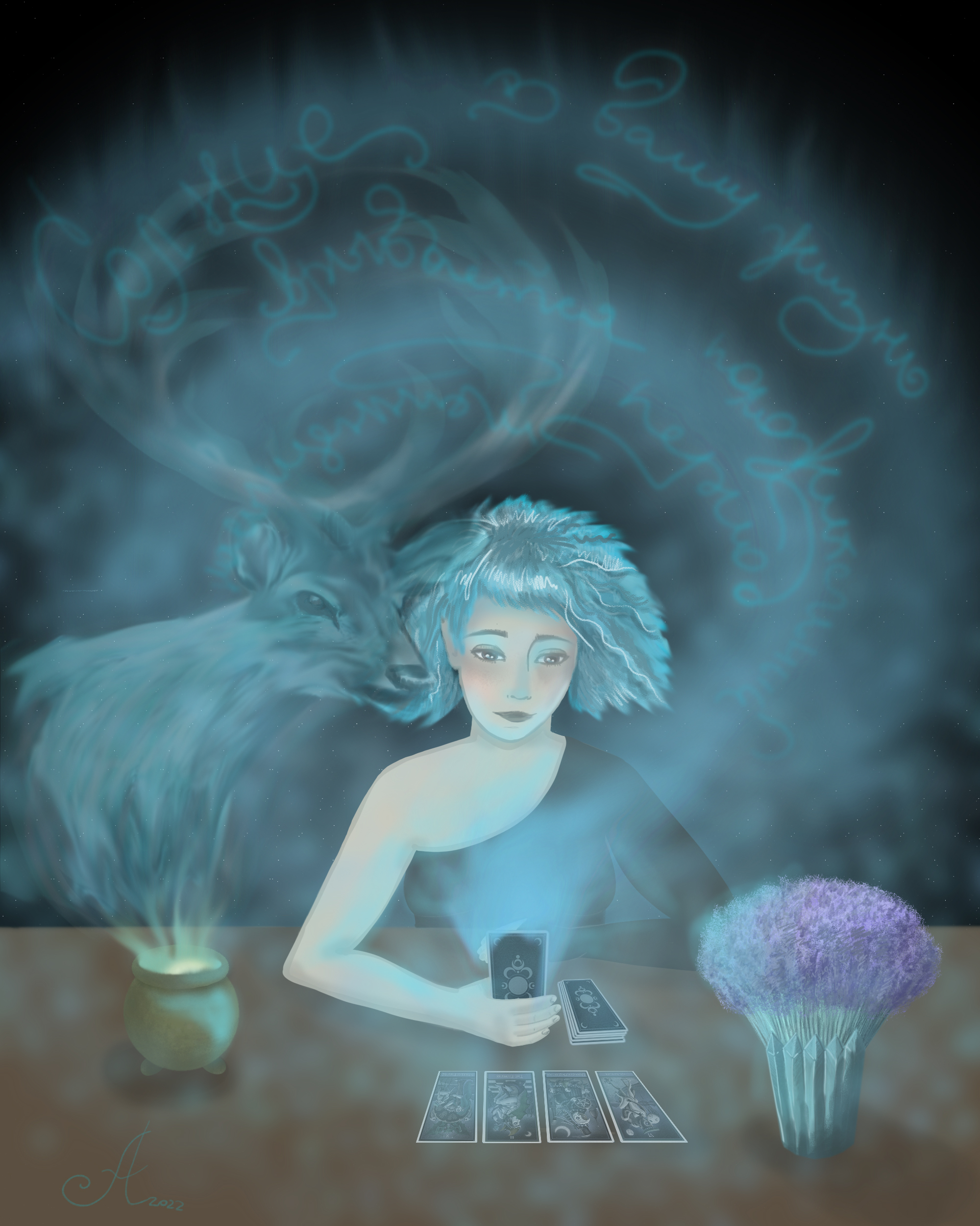 Моя подруга рассказала мне, что во время одной из эзотерических практик она познакомилась со своим тотемом, это оказался Олень и она так чётко мне его описала, что у меня в голове именно эта картинка возникла, я весь свой отпуск,вдали от компьютера, засыпая, видела в подробностях этот сюжет и после того как я отправила эту иллюстрацию моей подруге,она плакала. Это самый лучший отзыв для меня)