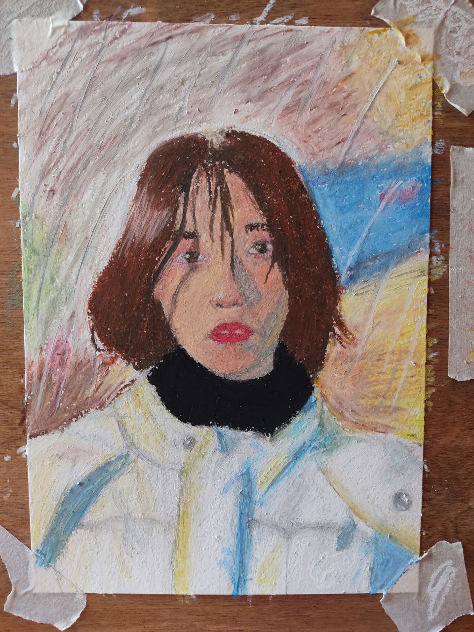 работа на формате А4, девушка в снежную погоду масляной пастелью