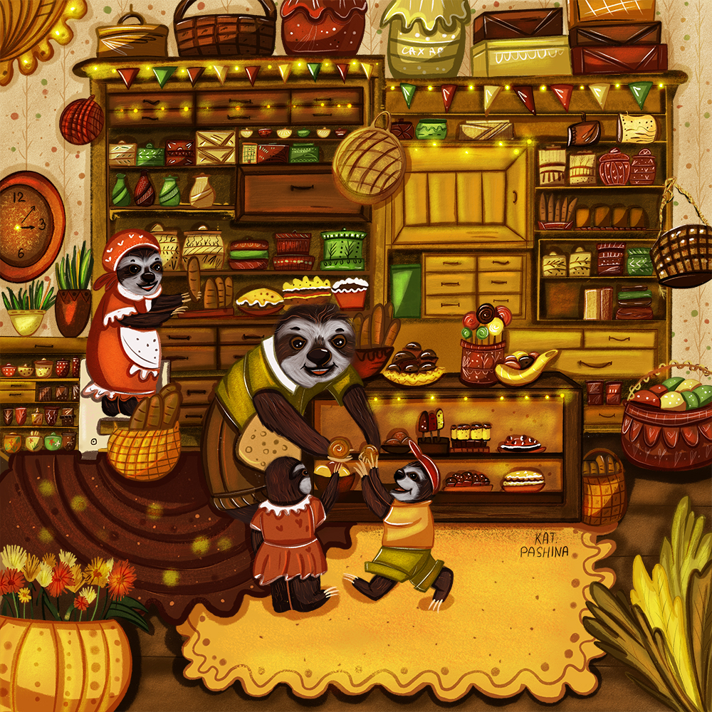 У ленивца по имени-Лорри, есть своя булочная. Он всегда раздает сладкие булочки детям)