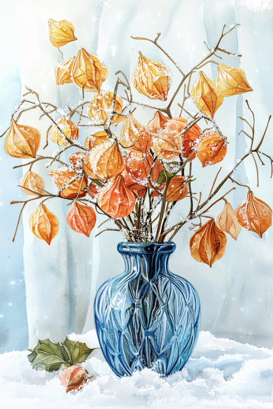 Физалис в стеклянной вазе. Нейроарт выполнен в стиле акварель.