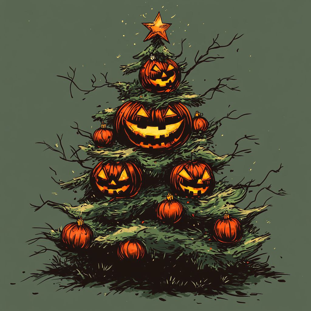 Рождественская елка в стиле Хэллоуин. Нейроарт выполнен в рисованном стиле.
