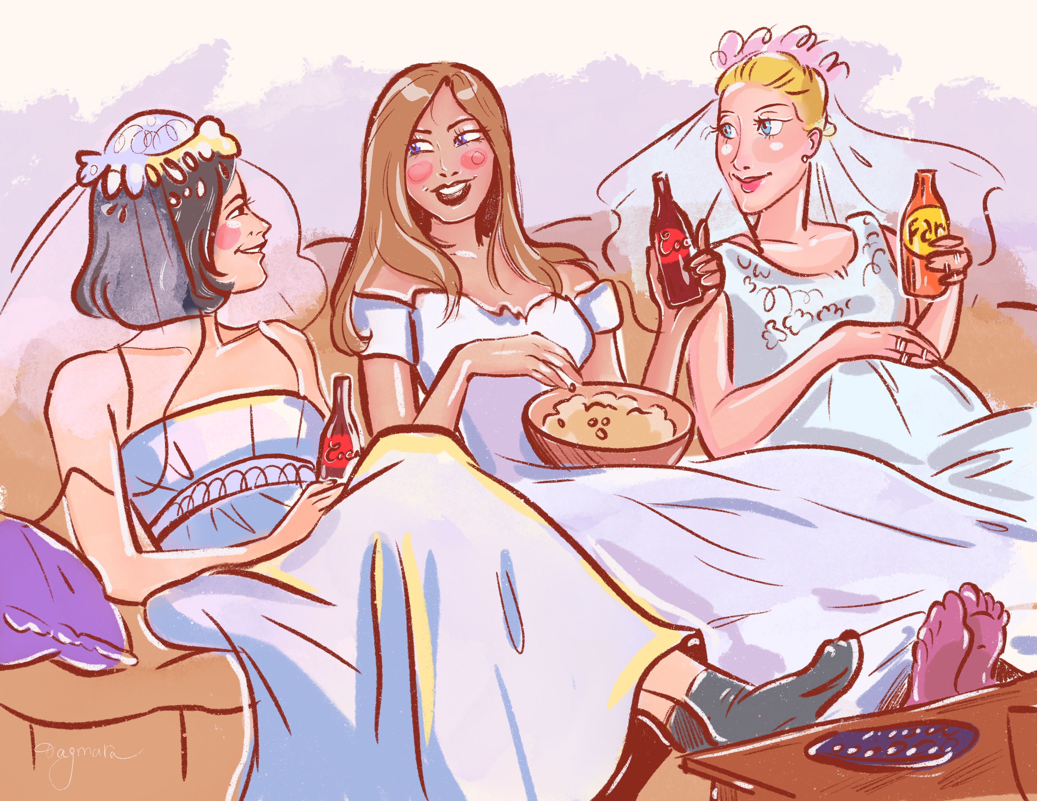 Иллюстрация, вдохновленная эпизодом из любимого мной сериала "Друзья", в котором Моника, Рейчел и Фиби нарядились в свадебные платья. Выполнена в программе Procreate.
