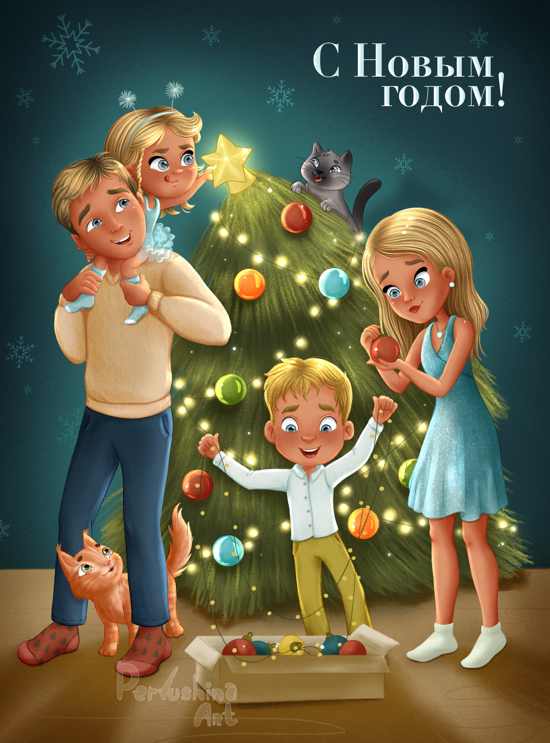 Семья маленькой девочки из предидущей иллюстрации, встречает Новый год!