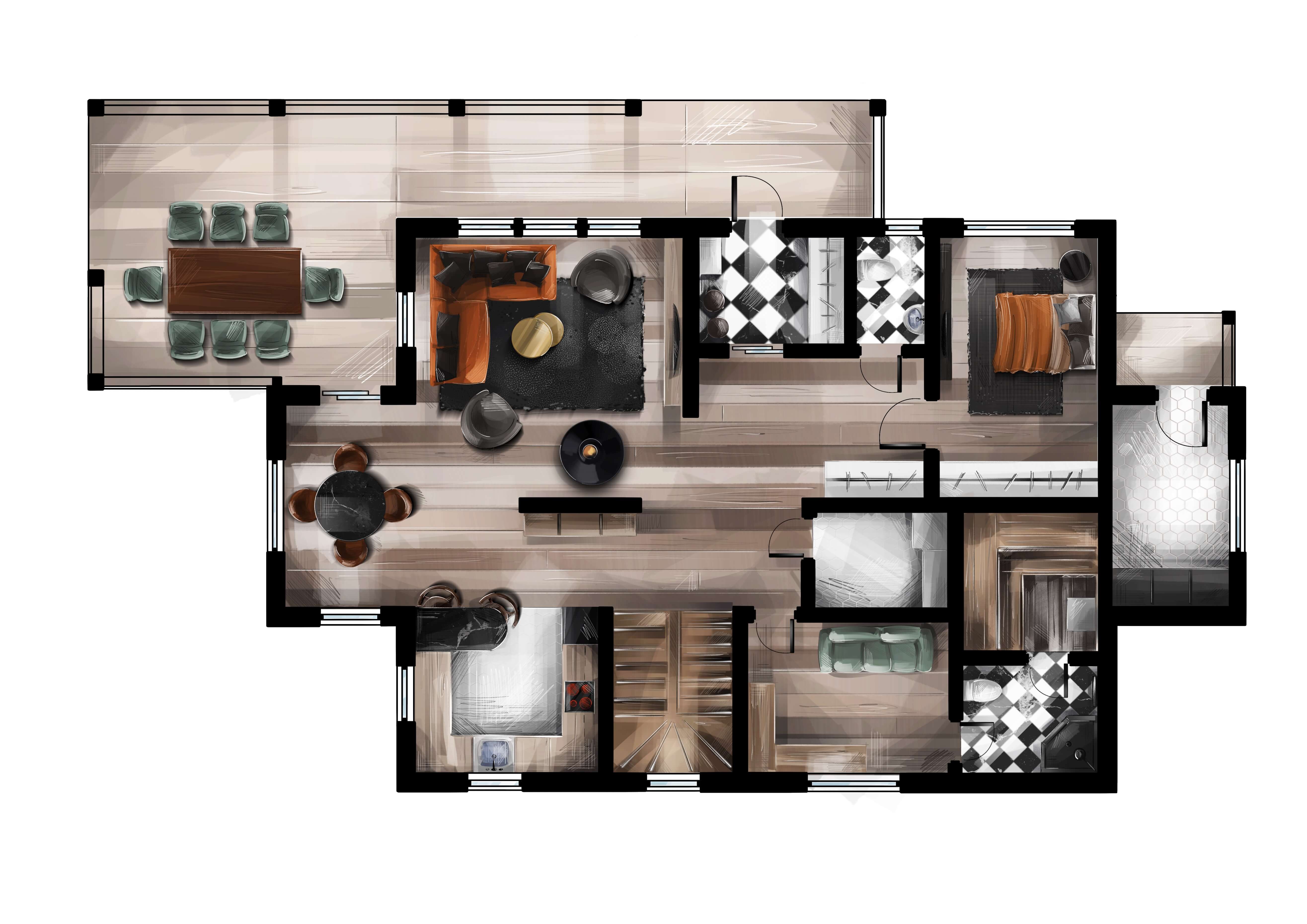 Отрисовка планировки загородного дома для застройщика в стиле ручной подачи и дизайн интерьера для презентации проекта.
