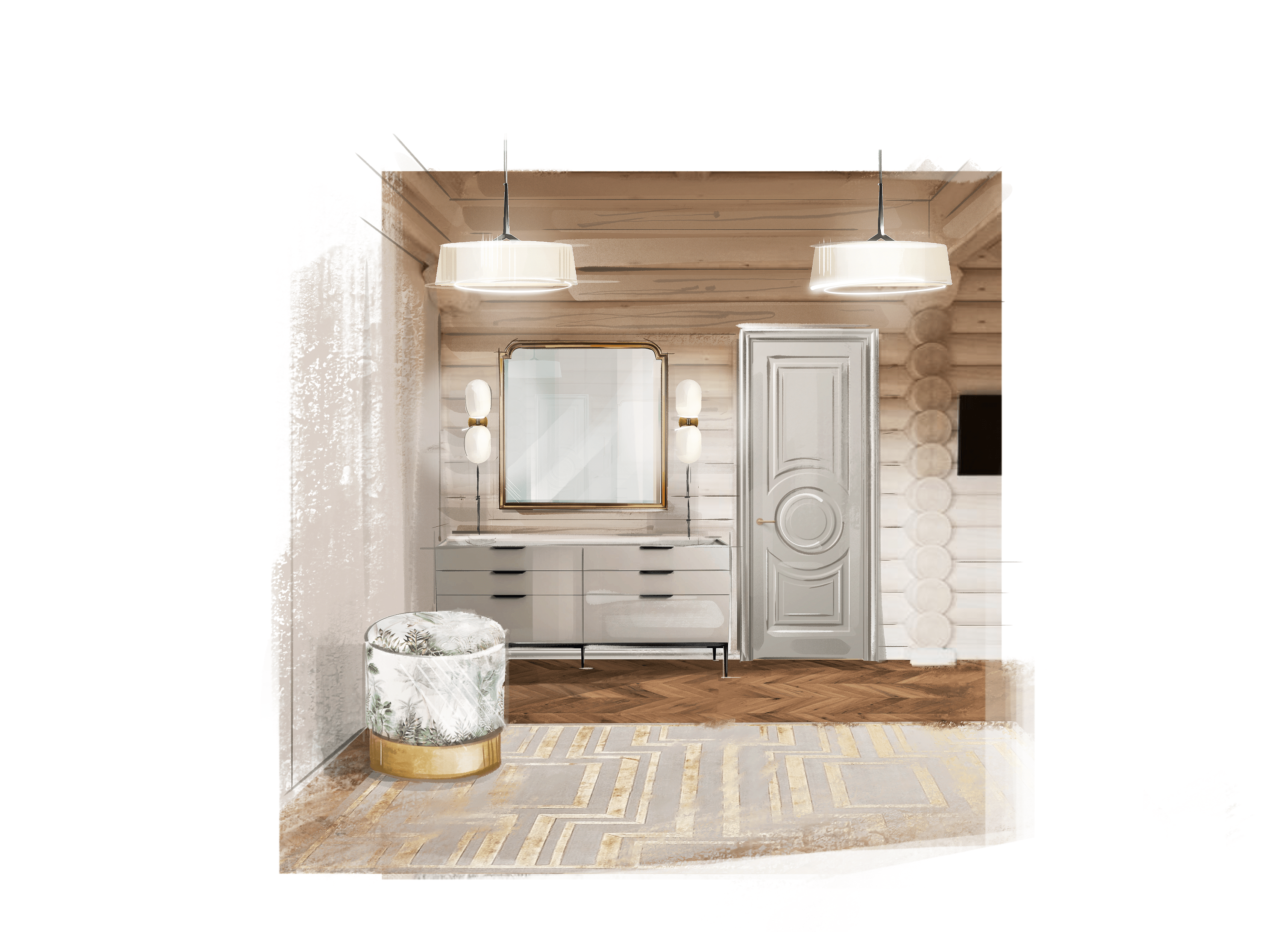 Скетч-визуализация редизайна интерьера для входной группы в загородном доме из бруса.