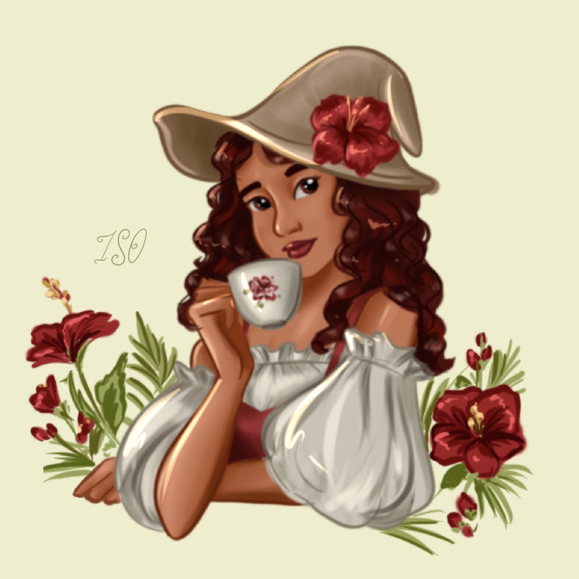Персонаж волшебницы за чашкой чая с гибискусом создан для концепт-проекта чайной упаковки.
