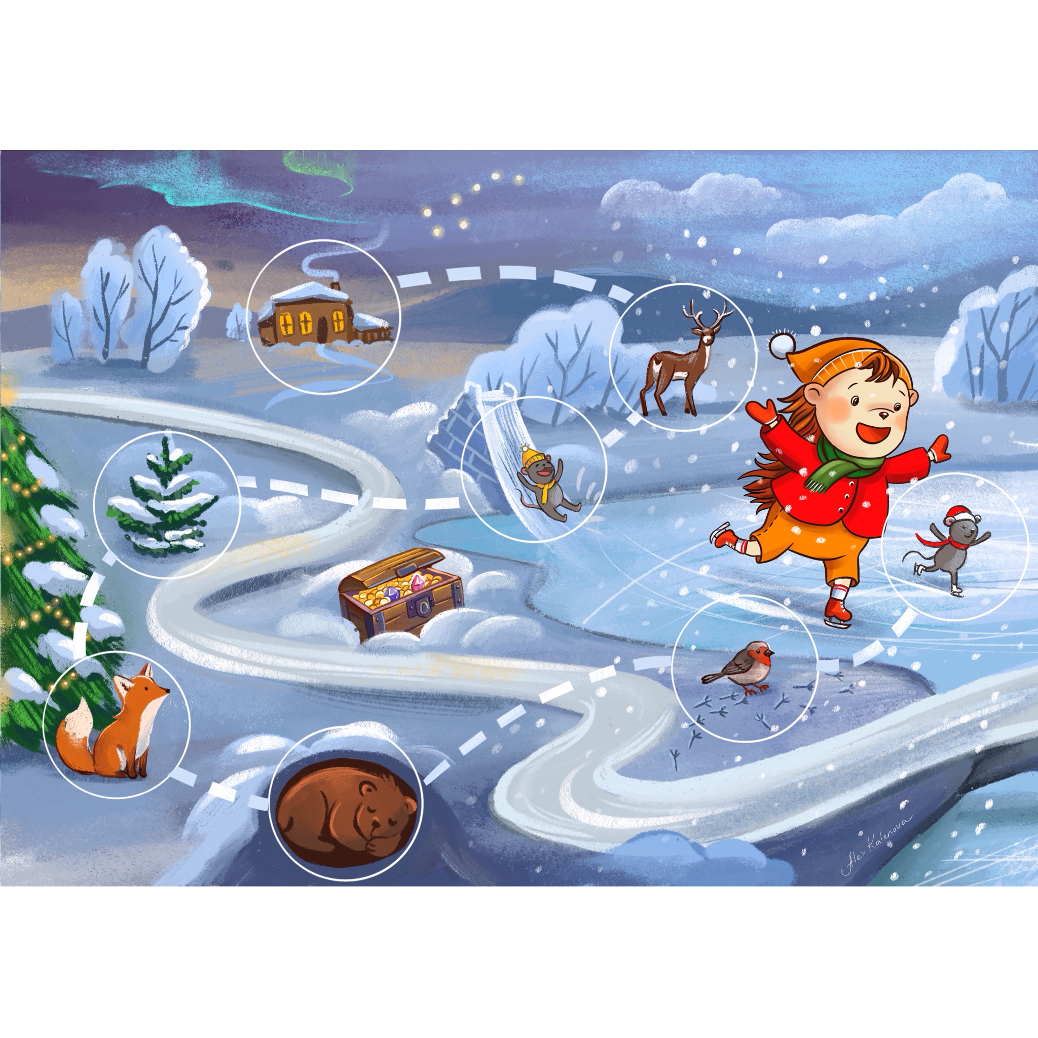 Иллюстрация для детского календаря с наклейками, с фирменным персонажем-ёжиком. Каждый кружочек - это наклейка, которую ребенок должен заработать за достижения, и наклеить в порядке, отмеченном пунктирной линией. Всего 8 призов-наклеек.
