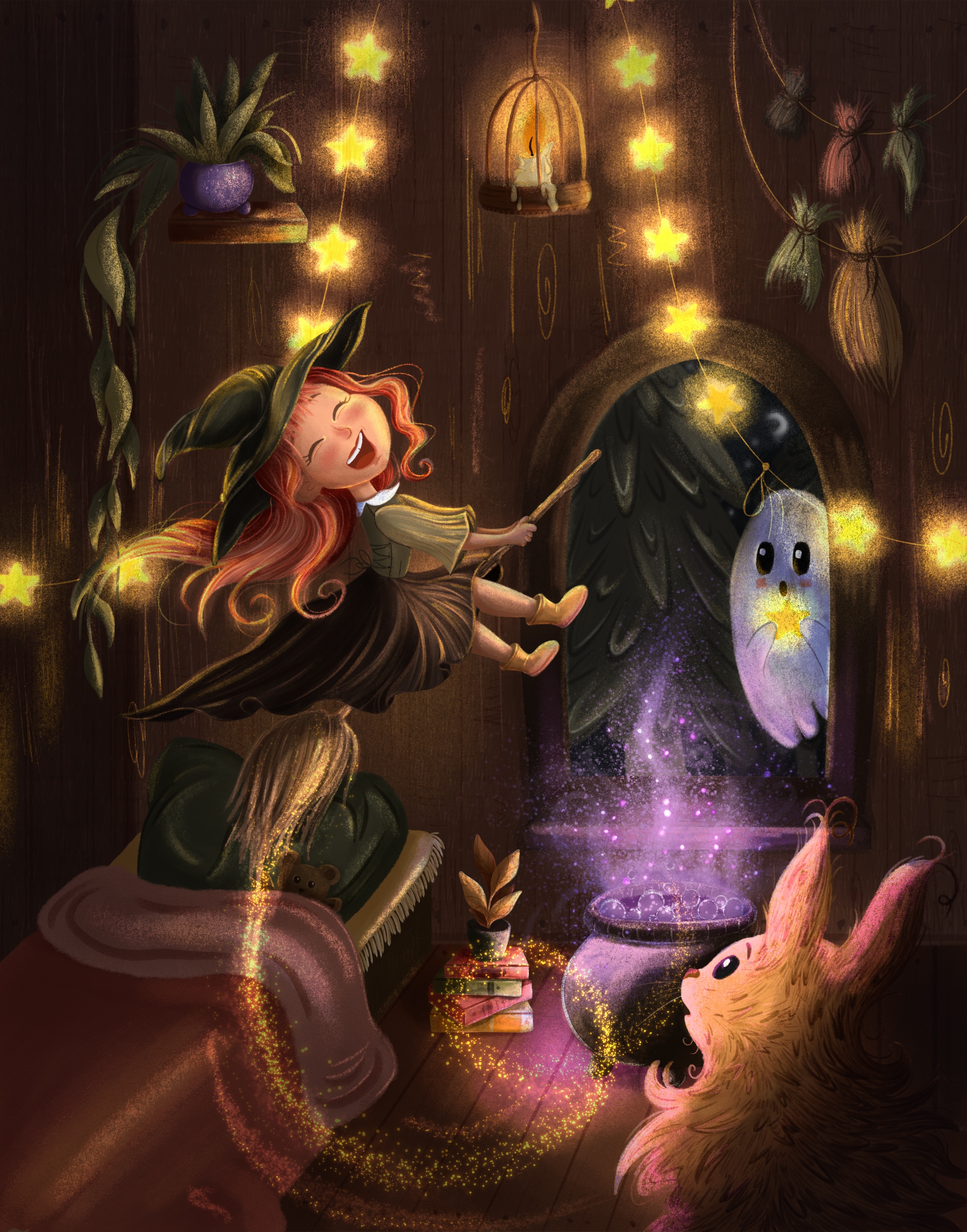 Иллюстрация сюжета, где девочка-ведьмочка с озорным весельем летает по своей комнате, а её друзья кот и призрак удивляются глядя на неё