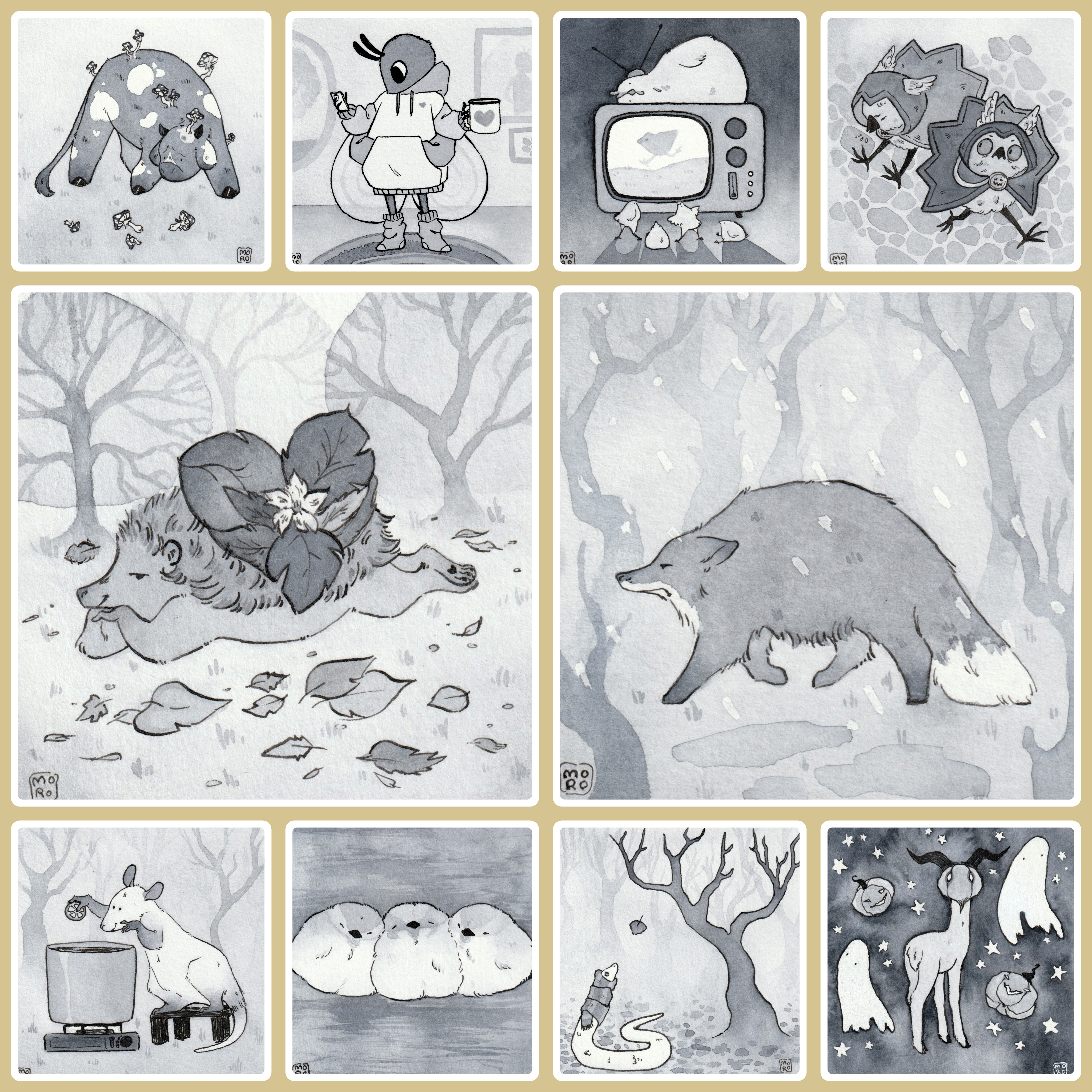 Коллаж из всех иллюстраций на Inktober 2024. Список тем от художника "странные зверьки"