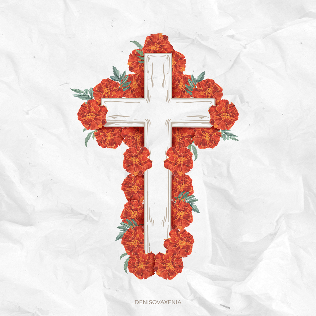 Крест с красными бархатцами. Акварельная иллюстрация. Цветы бархатцев на день мертвых.