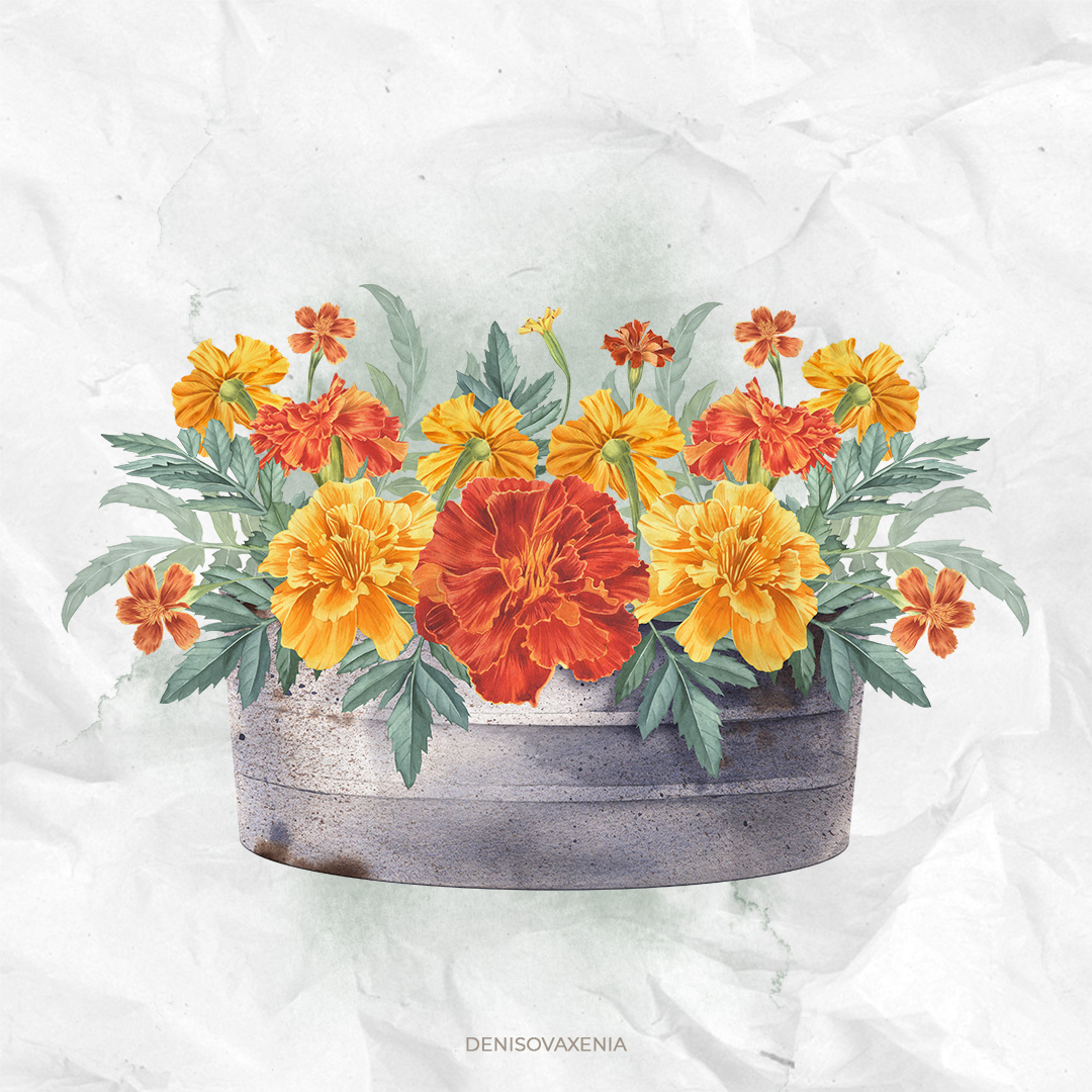 Бархатцы в тазике. Яркая цветочная композиция в металлическом вазоне. Акварельная иллюстрация. Желтые и красные садовые цветы. Бархатцы для оформления открыток, текстиля, упаковки, этикетки, плаката.